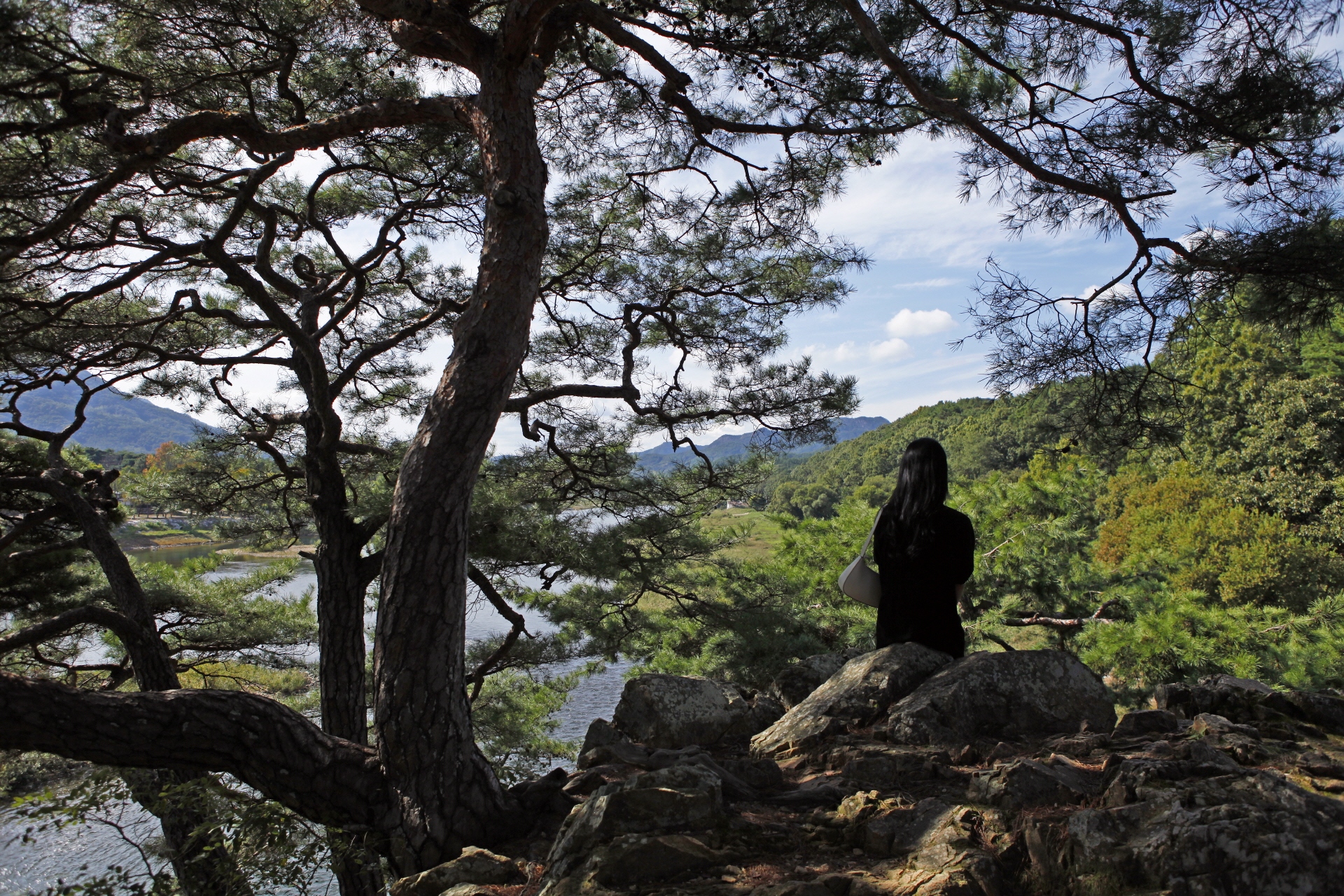 금강둘레길 양산 제2경인 강선대에 홀로 앉아 금강을 내려다 보고 있는 여인의 뒷모습이 아름답습니다.