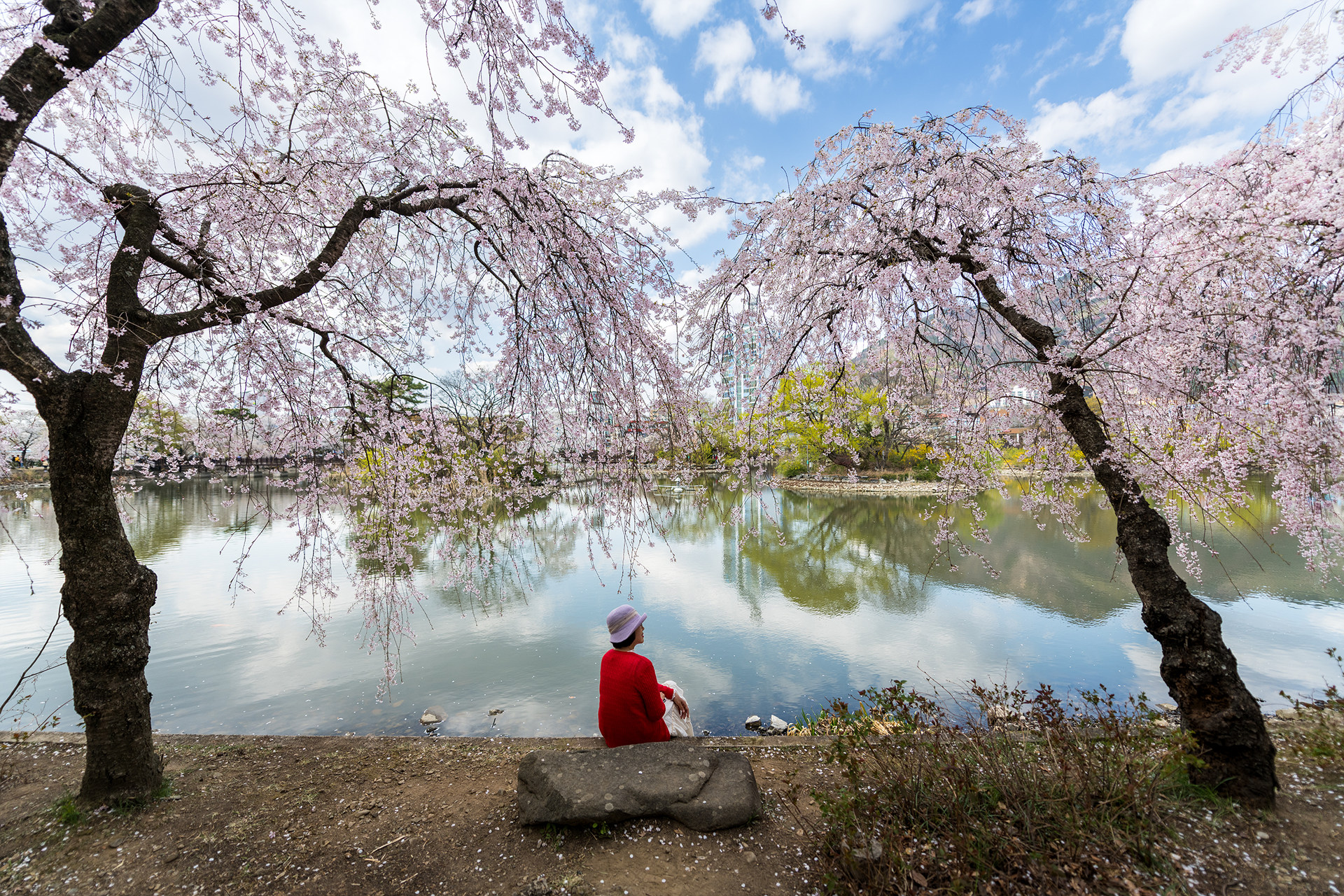 분홍색 수양벚꽃이 곱게 피었어요.