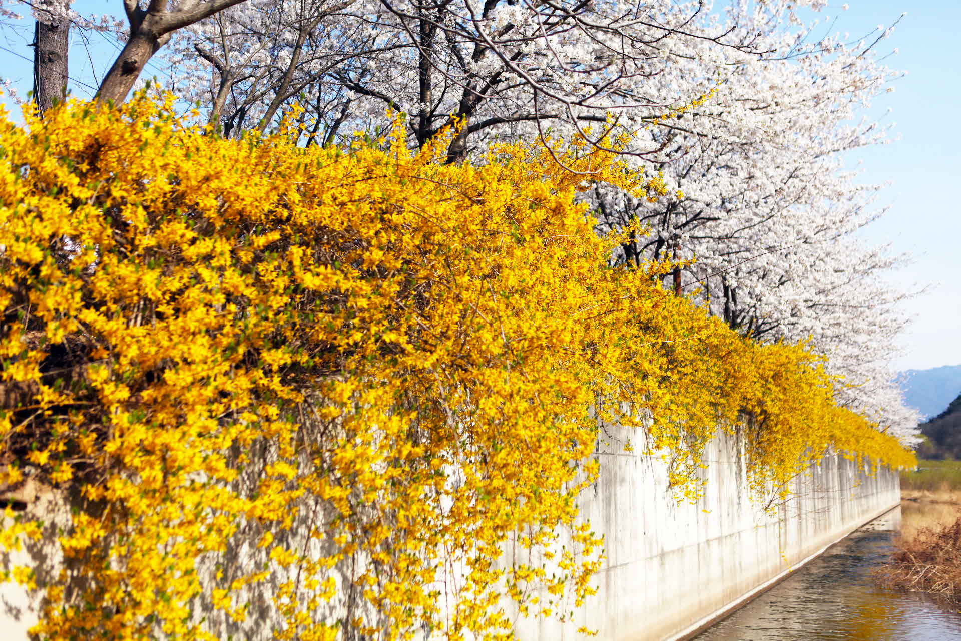 개나리와 벚꽃이 아래 위로 피어 있어 아름답습니다.