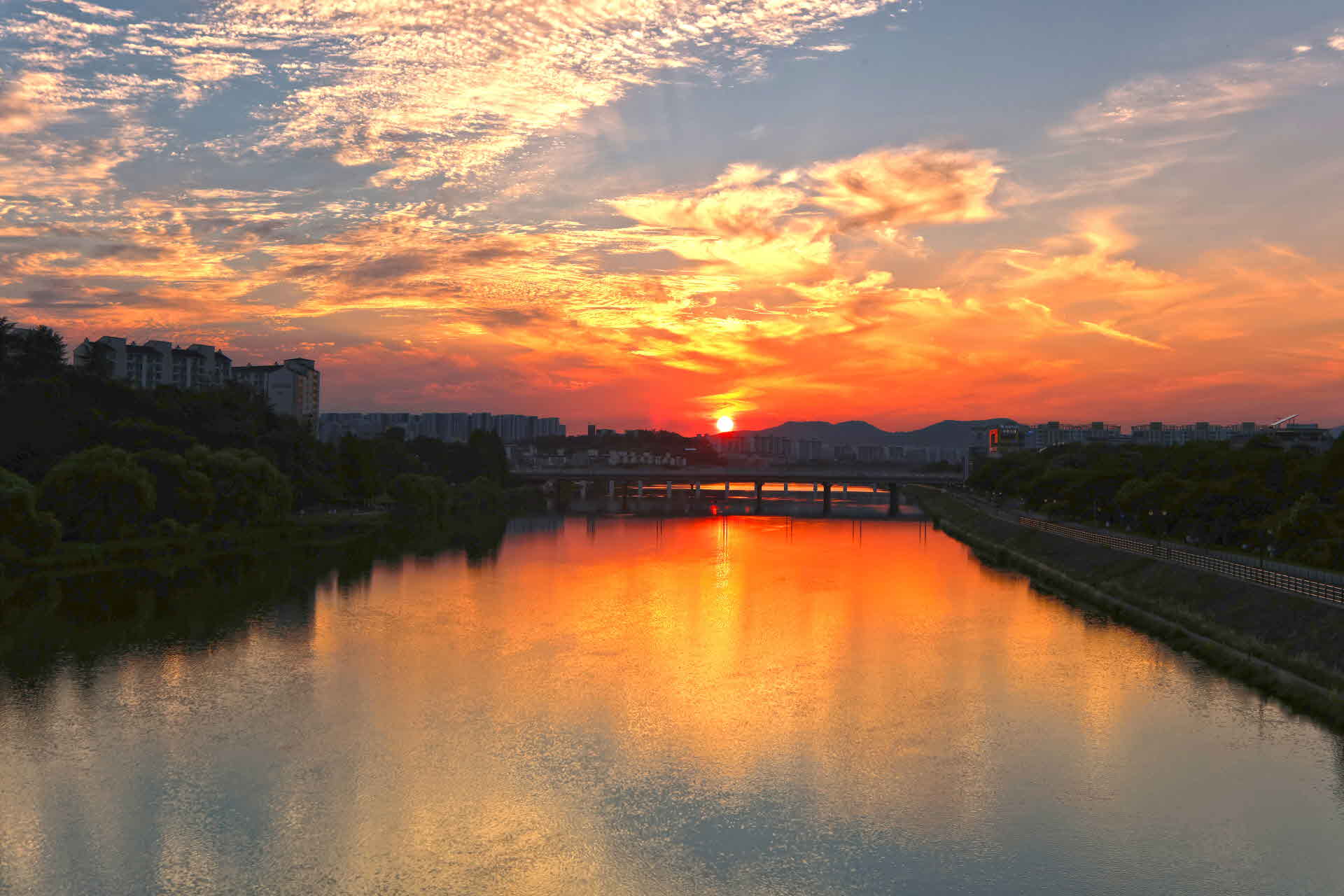 동촌 해맞이 다리에서 아양교 쪽을 바라보는 일몰 풍경입니다.