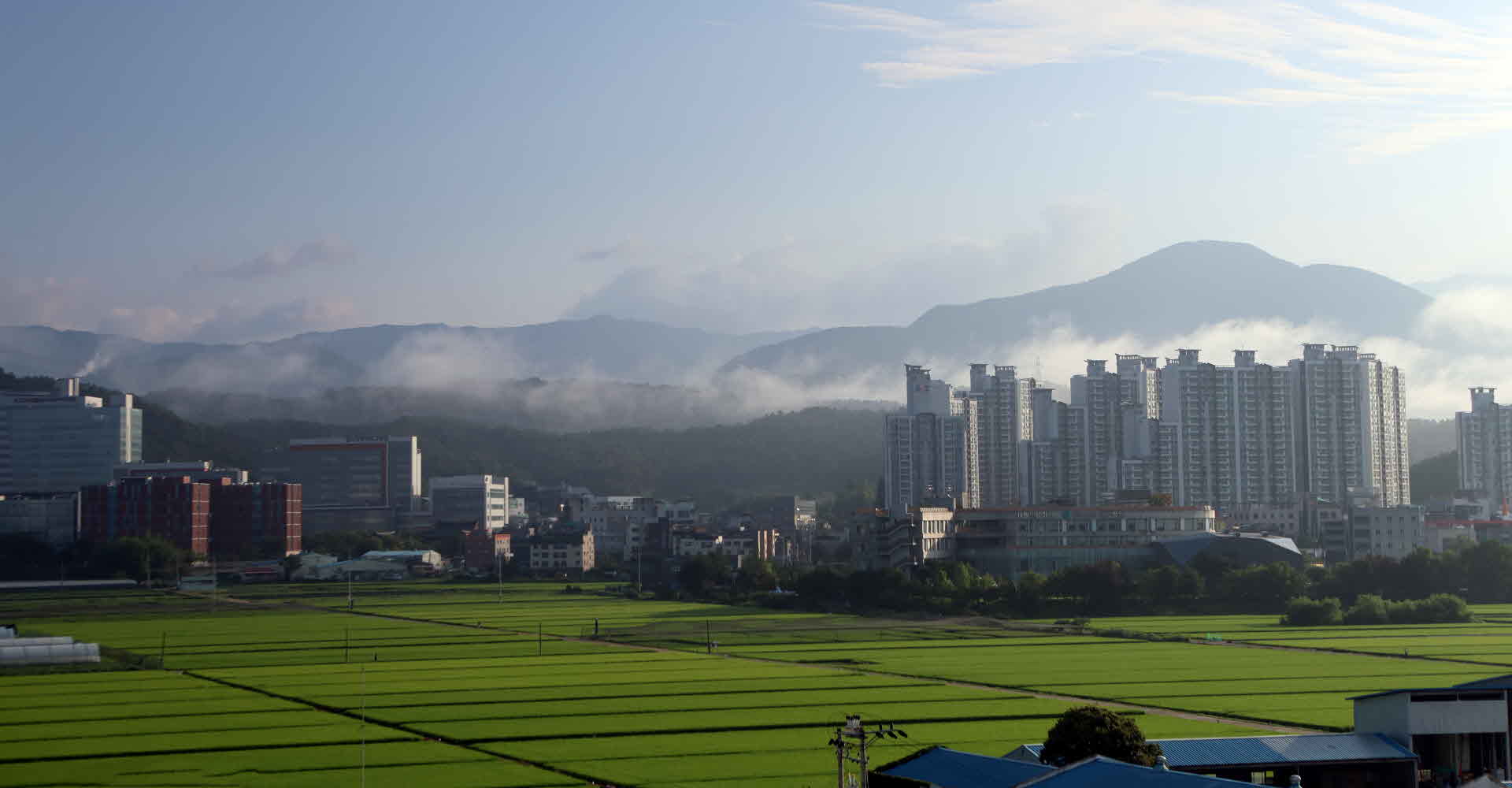 밤에 비가 내리다 개인 날 아침 안개와 구름이 산 허리에 둘러있어 참 보기 좋습니다.