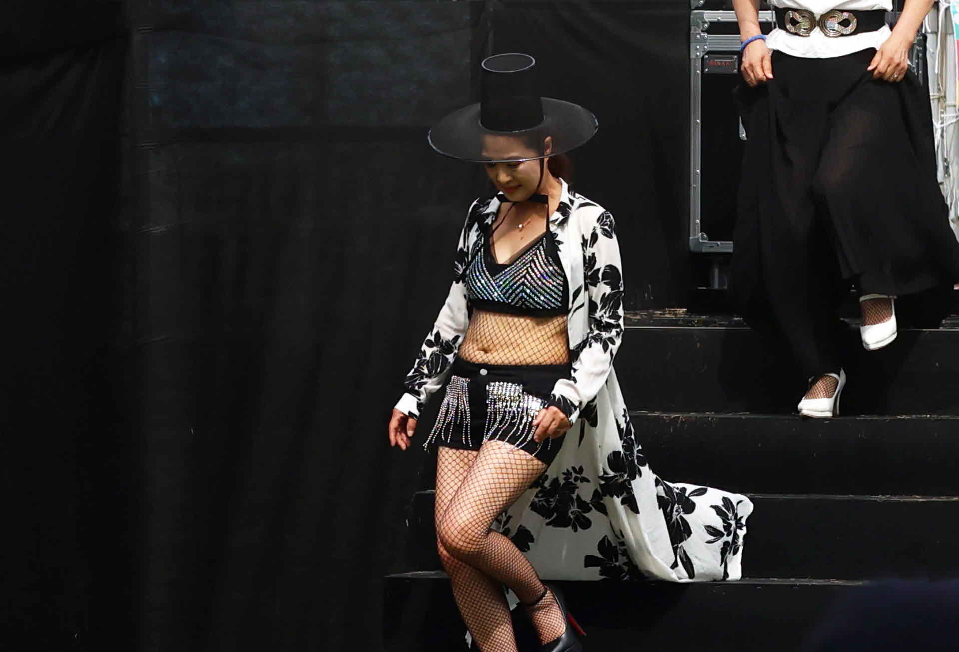 제16회 대전효문화뿌리축제에서 갓을 쓴 모델이 무대에서 내려오고 있습니다.