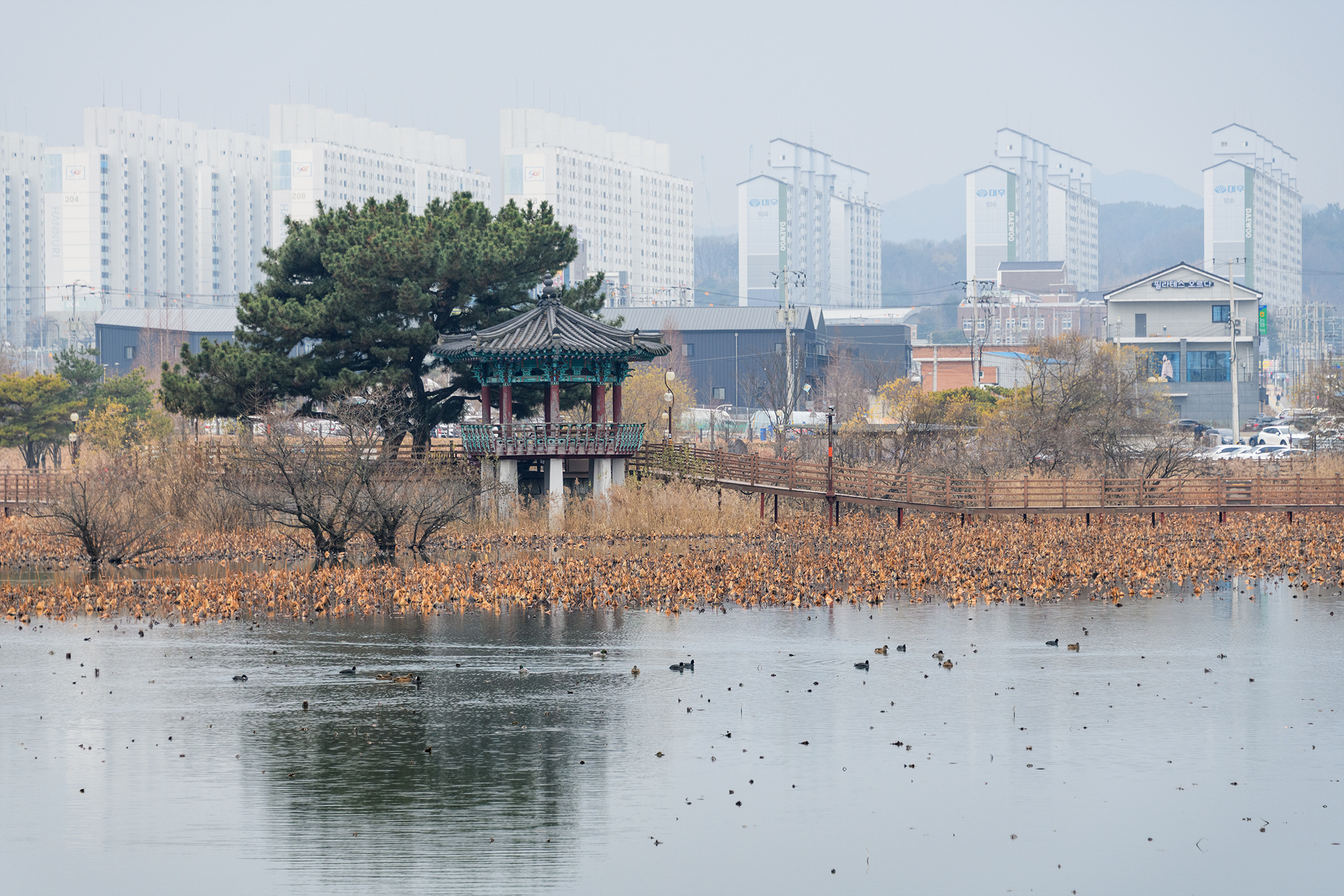 여우의 전설이 있는 문성지 몽호정(夢狐亭) 앞에는 물닭과 청둥오리들이 노닐고 있어요.