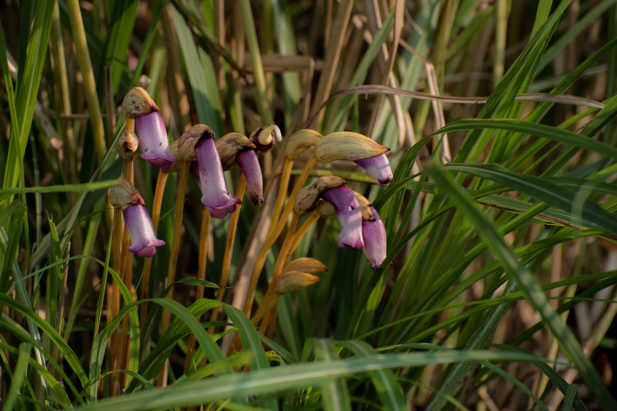 엽록소가 없으며 억새 또는 생강에 기생하여 자란다. 적갈색을 띠는 줄기는 아주 짧아 땅 위로는 거의 나오지 않으며, 몇 개의 비늘조각처럼 생긴 포(苞)들이 달린다. 9월경 줄기에서 나온 긴 꽃자루 끝에 연한 자주색의 꽃 1송이가 옆을 향해 핀다. 꽃은 길이가 3~5㎝ 정도인 통꽃이지만 꽃부리[花冠]가 약간 갈라져 있다. 꽃받침은 길이가 2~3㎝로 주걱처럼 생겨 꽃의 아래쪽을 감싼다. 열매는 삭과(蒴果)로 익는다. 한국에서는 제주도에만 분포하며, 뱀에 물렸을 때 사용하나 인체에 해로운 독이 있으므로 유의해야 한다.