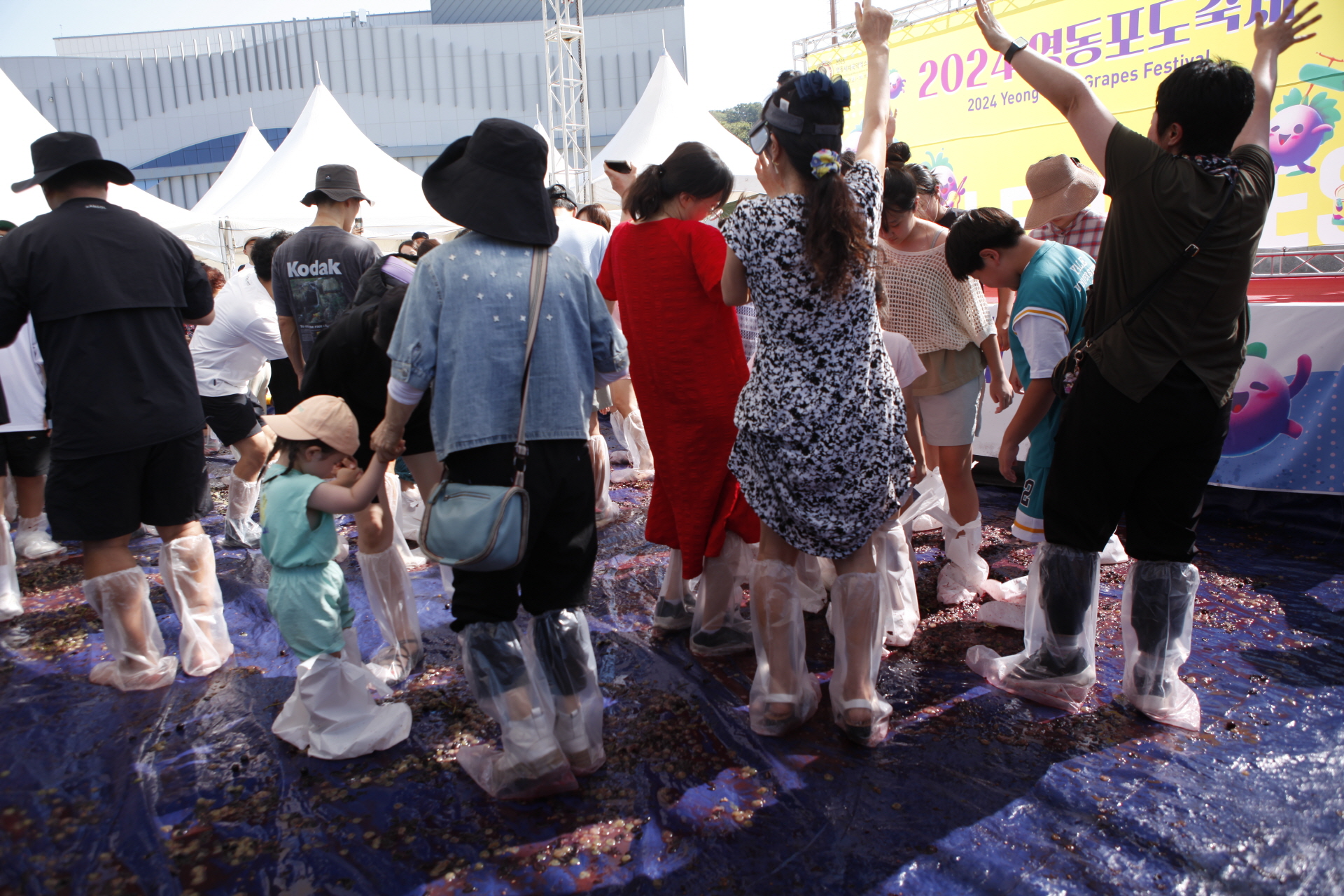 포도 밟기 행사 참가자들이 즐거워하고 있습니다.