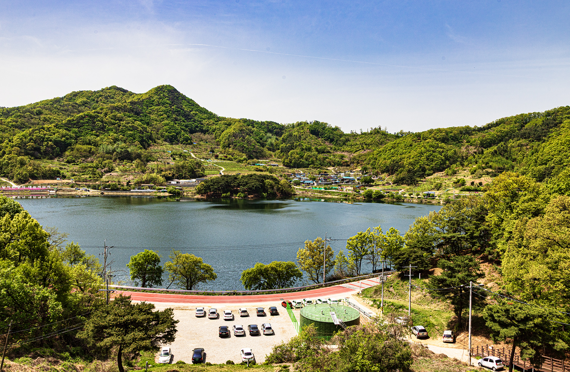 선산 휴게소에서 본 저수지가 있는 마을이다.