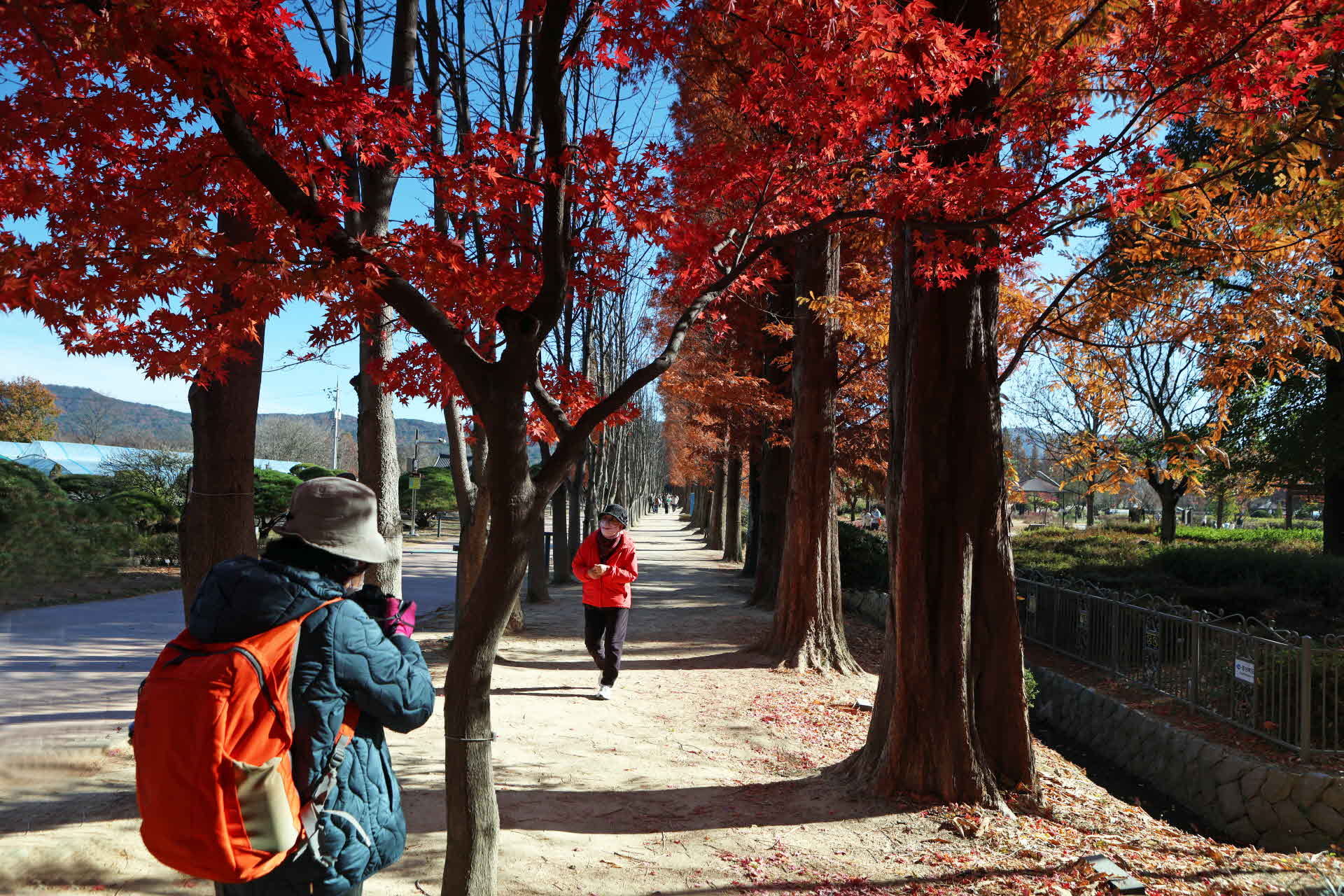 붉은 단풍나무 아래 가을이 깊어가고 있습니다.