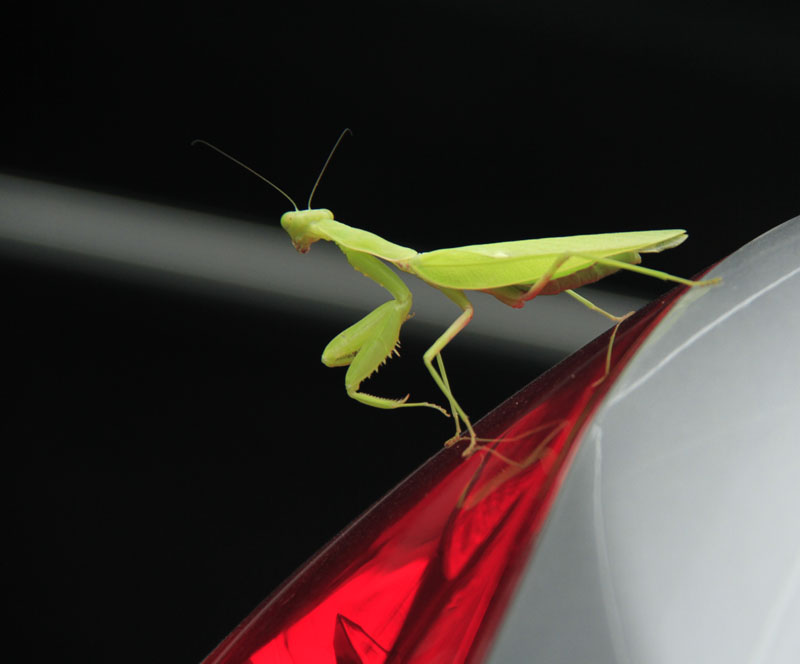 아파트 주차장 차 위에서 사마귀가 혼자 놀고 있다.