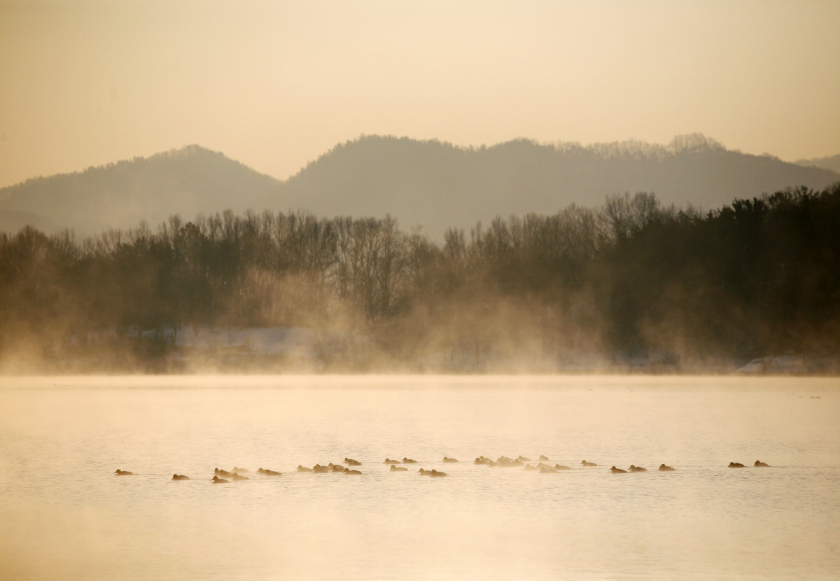 물안개속 오리들이 나들이 간다 발자국 소리에 멀어져간다