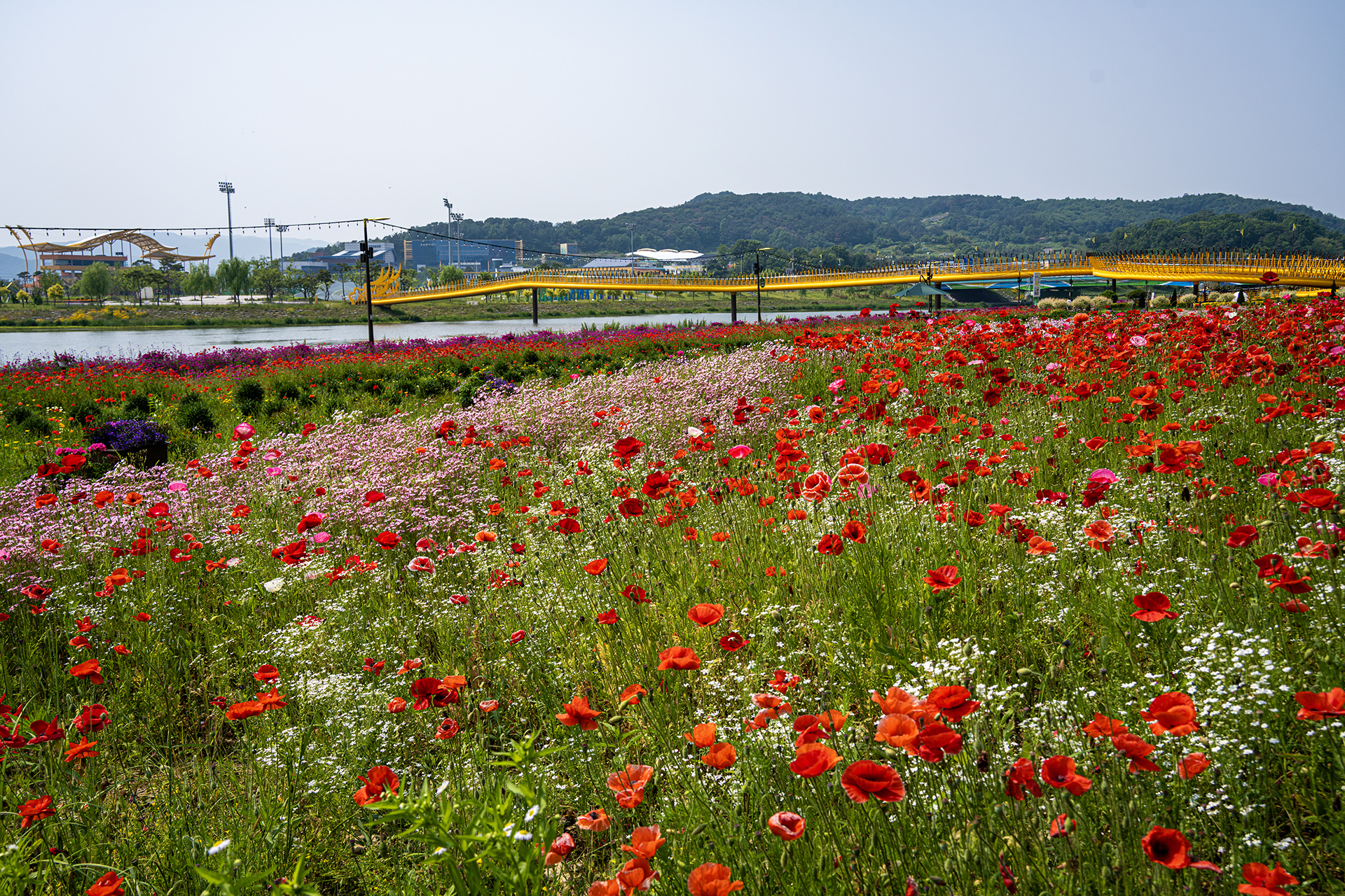 황룡강의 노란색 다리가 양귀비의 현란함에 빛을 잃었다. 꽃양귀비의 시대입니다.