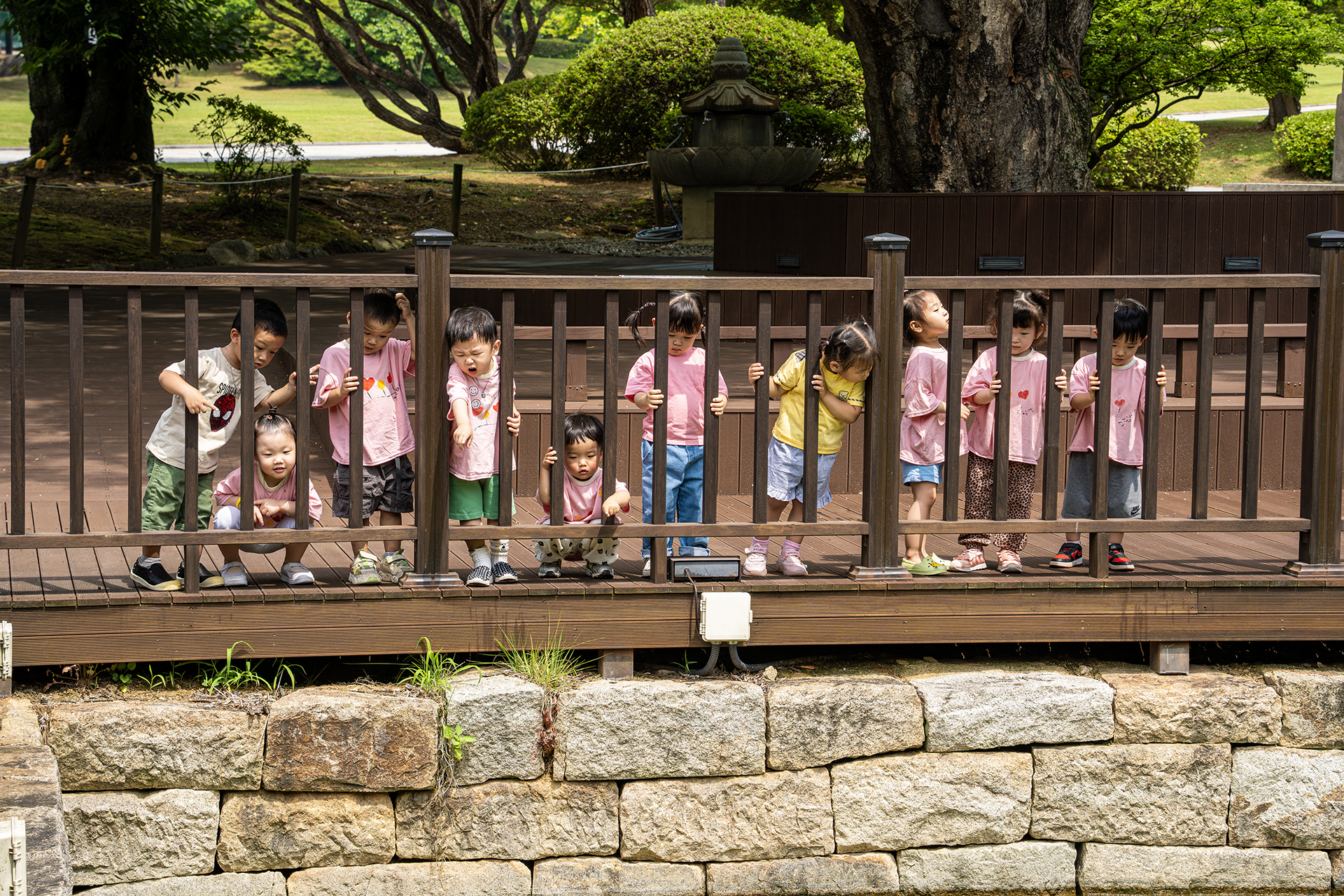 유치원 아동들이 연못앞에서 즐겁게 놀고 있군요.