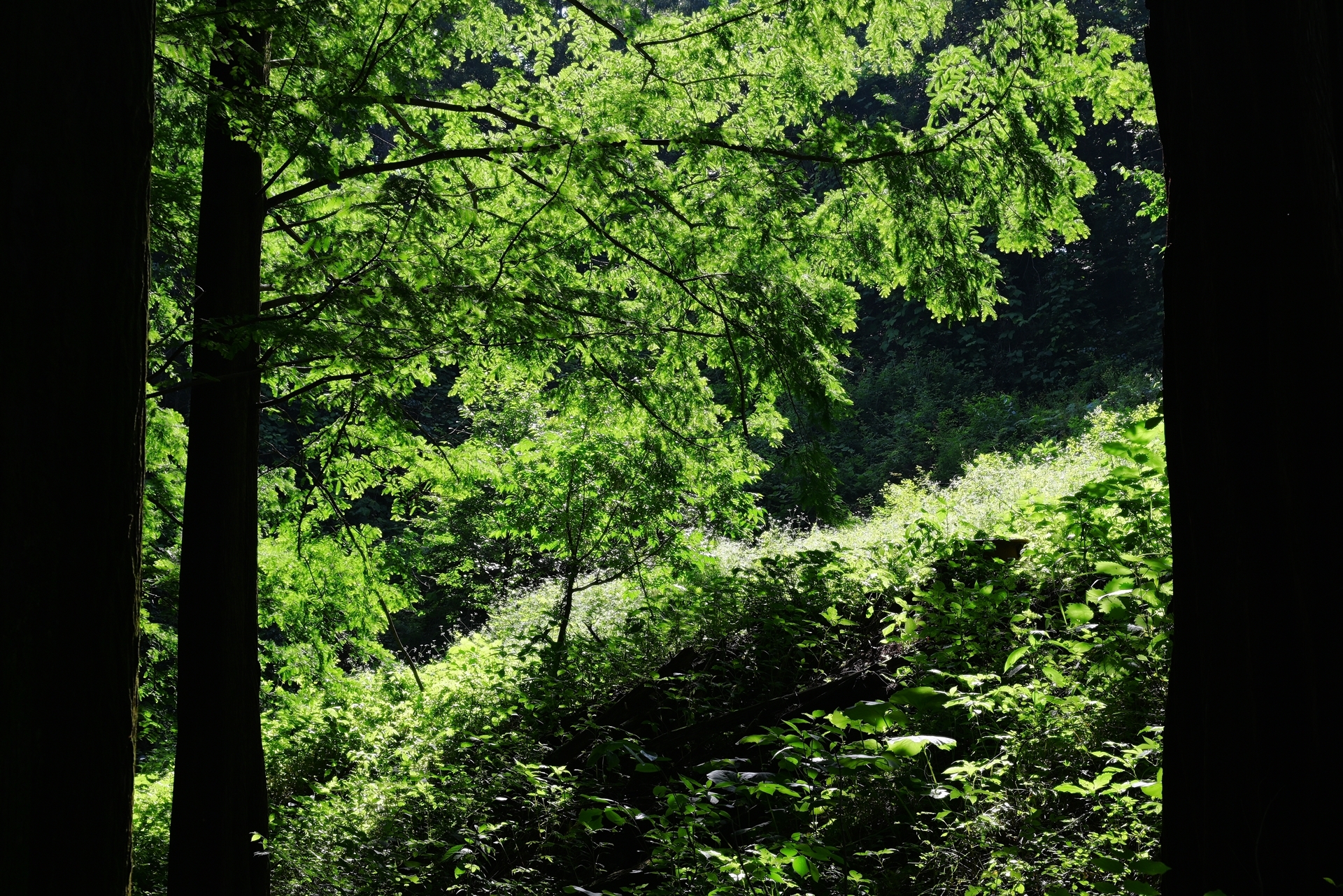 어두운 숲길에 찬란한 빛이