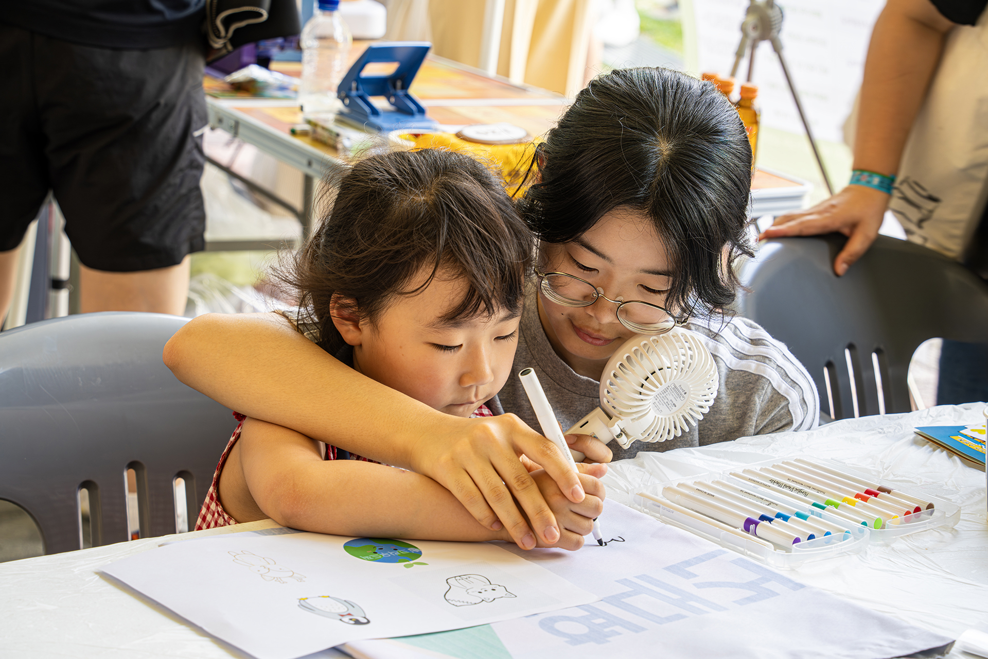 진지한 엄마와 딸은 그림그리기에 열중합니다. 축제에서 어린이 그림그리기 대회인듯 하네요.