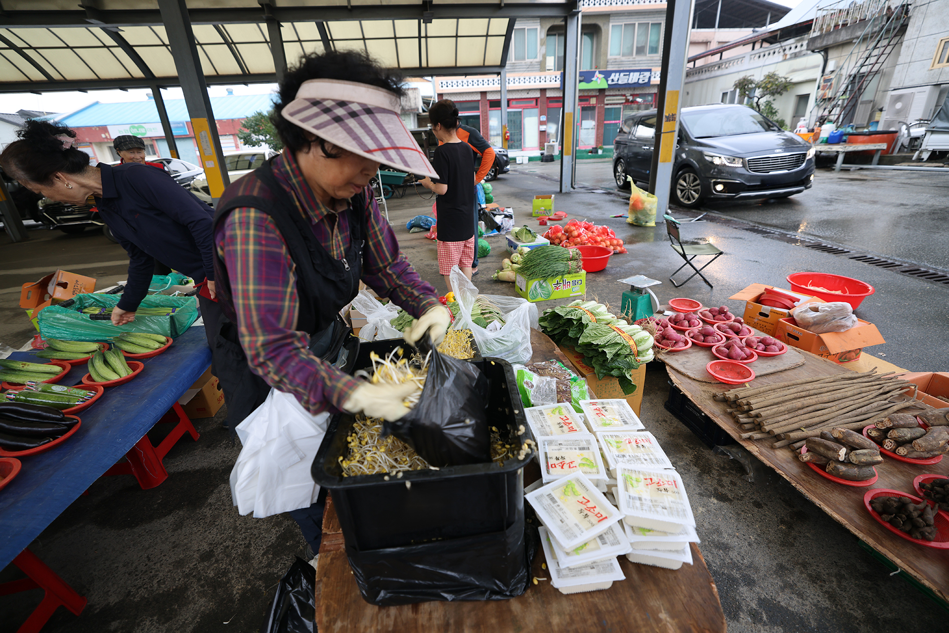 비 내린 아침, 장터의 손길이 분주하다.