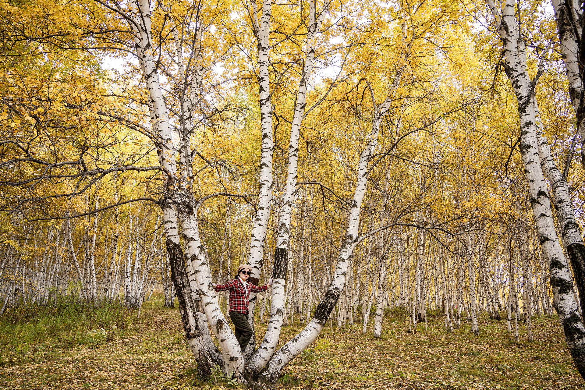 드넓은 초원에 단풍이 잘 든 조그만 자작나무숲과 여인이 있습니다.