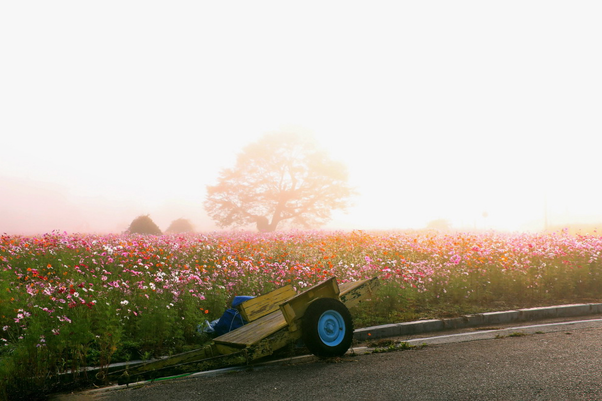안개속의 코스모스밭