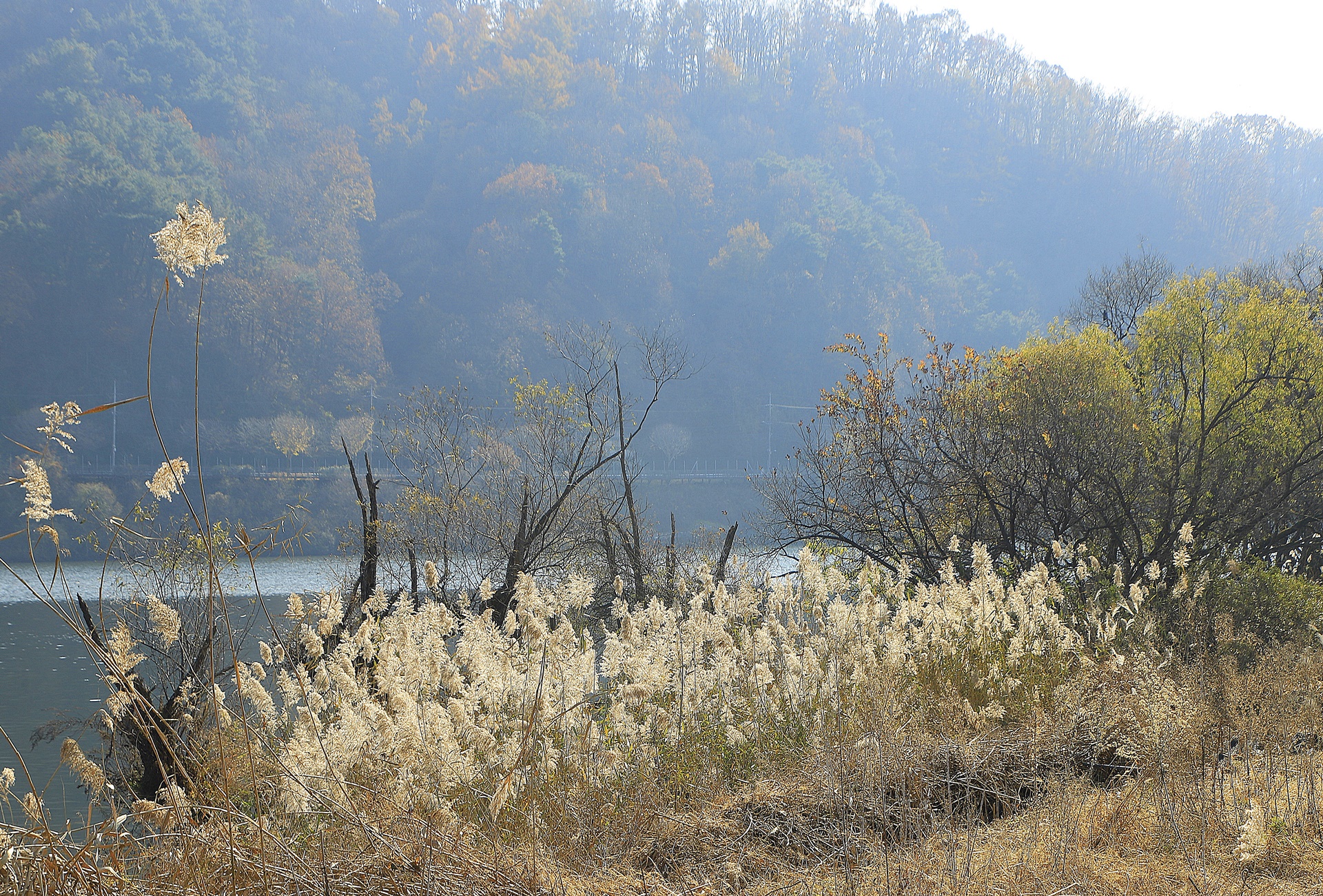 늦가을 호숫가 갈대 풍경