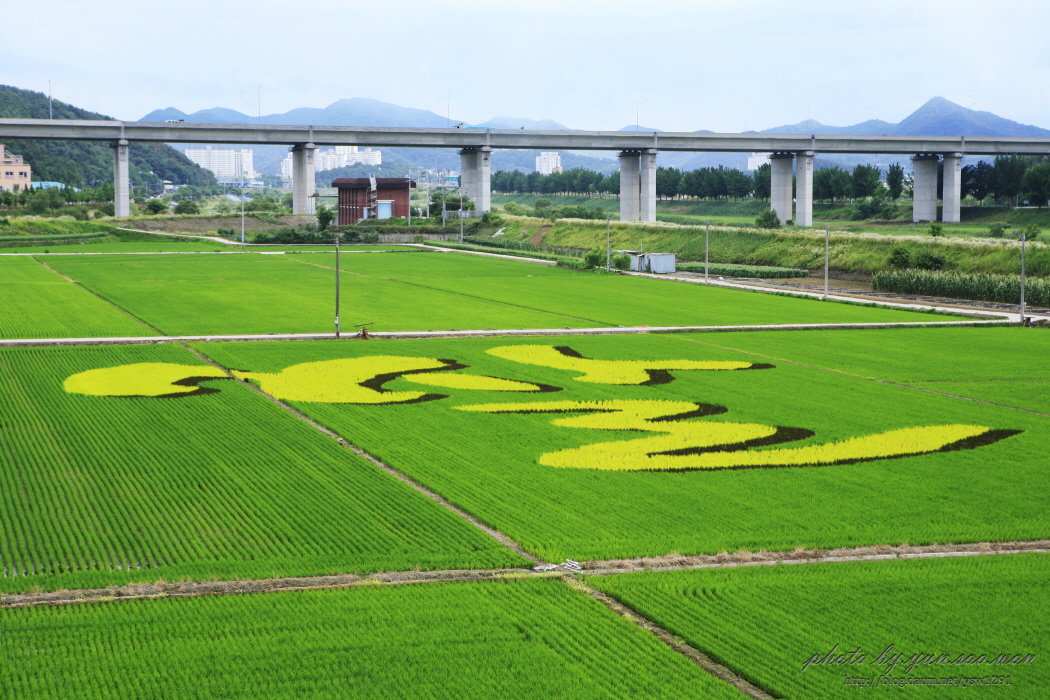 정안천 연꽃에 마음을 빼앗기고 외곽 도로에 차를 모는중 벼논에서 광고 글씨가 시야에 들어온다