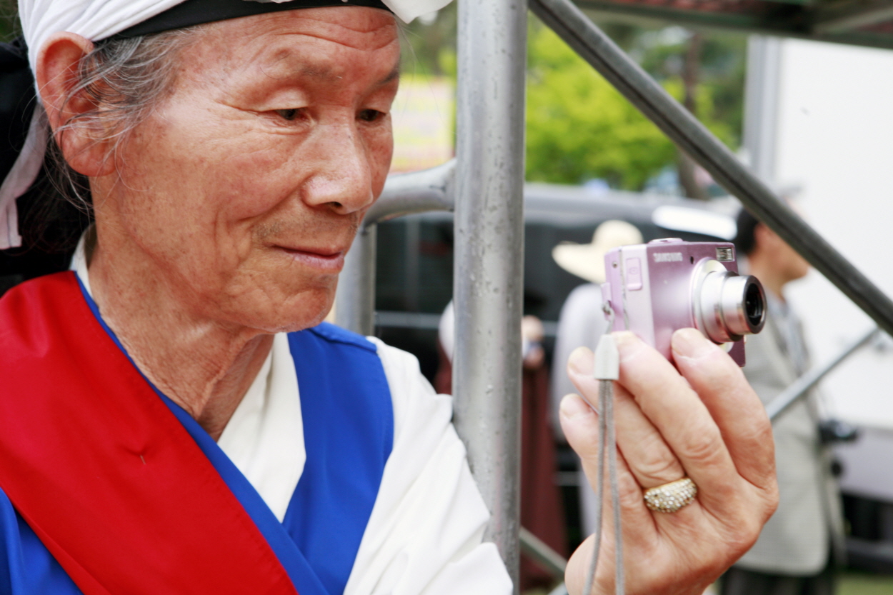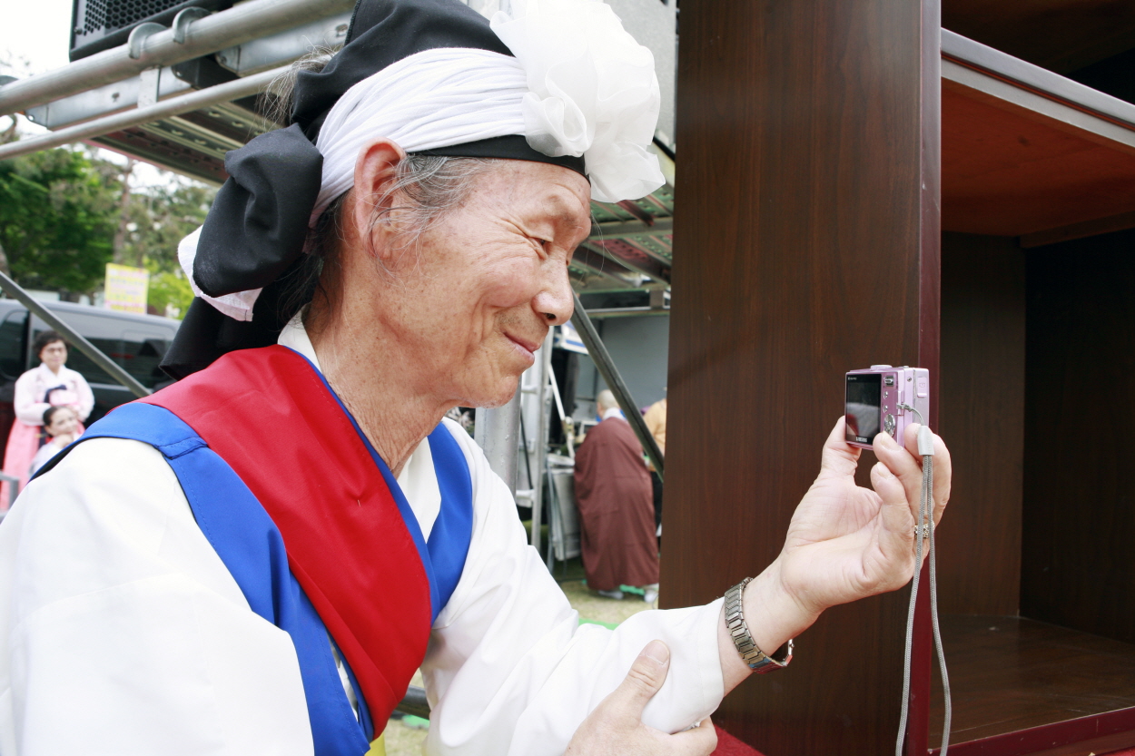 연등축제중 바라춤을 동영상으로 노인이 디지털 카메라로 동영상을 담는다