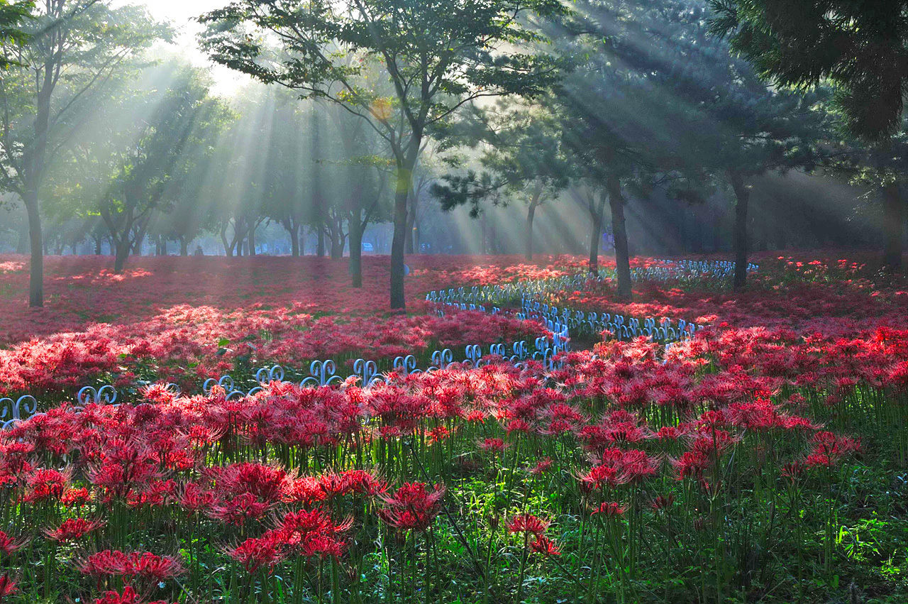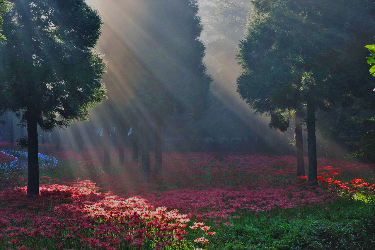 (꽃무릇 머리 위에 서리인지 이슬인지가 하얗게 내렸네요.)