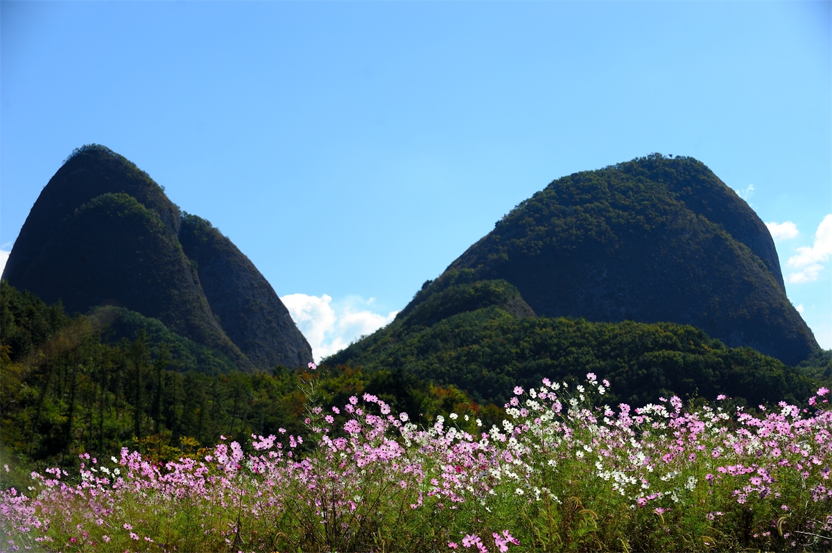 코스모스 만발한 북쪽 마이산의 가을 소경.