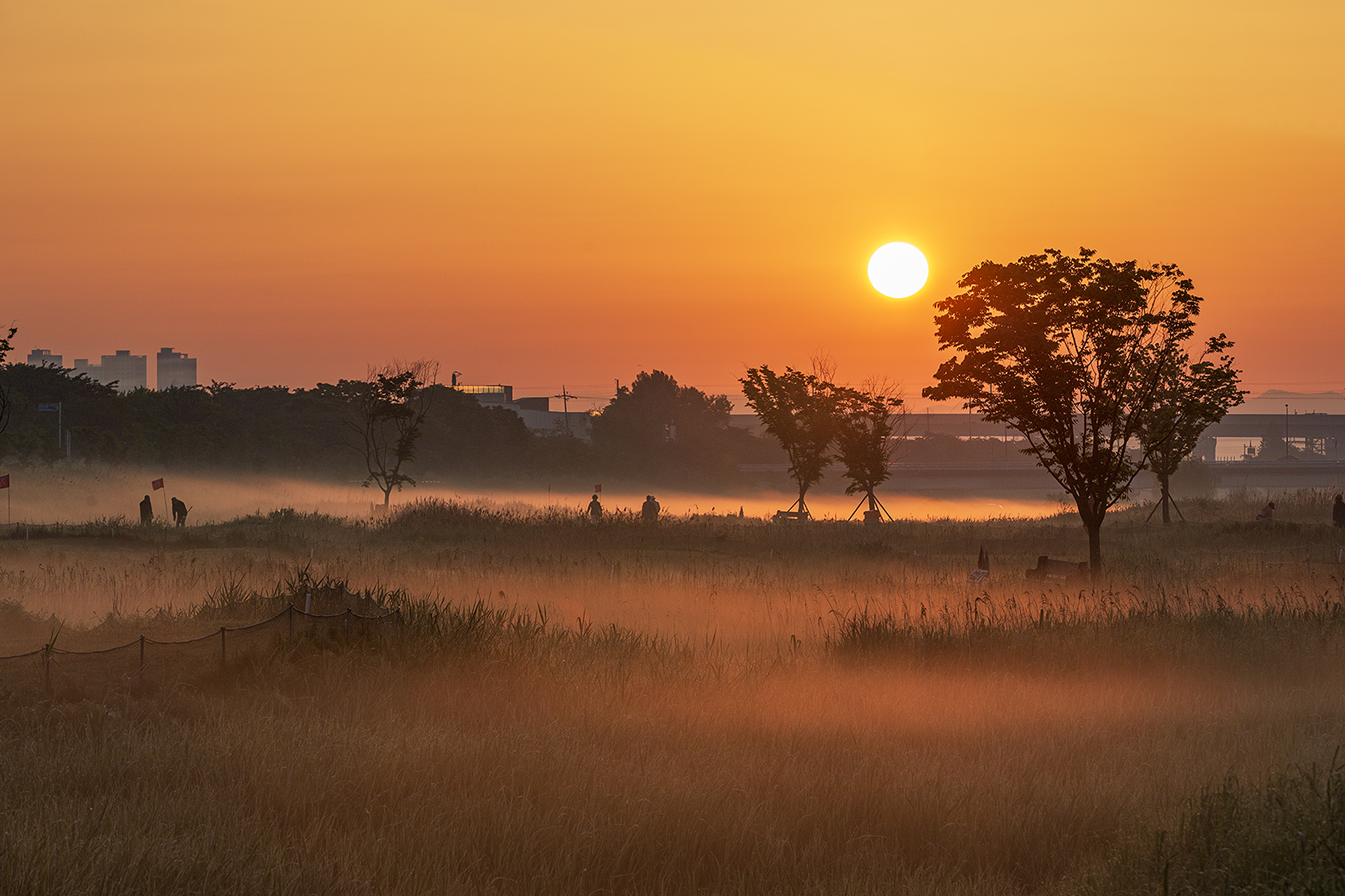 익산과 김제의 경계를 이루는 곳에 만경강이 흐르고 있습니다. 저는 그 강에 놓인 여러 개의 다리 중 제법 긴 목천대교를 지나 출근을 합니다. 만경강은 강이라고는 하나 기중 20% 정도만 물이 흐르고 나머지는 습지이지요. 어느 출근 날 대교아래 제법 두껍게 낀 안개를 본 순간 이곳이 안개 사진의 보고임을 알고 그때부터 이튿날의 날씨 조건이 좋으면 한 시간 반쯤 일찍 나와 안개를 만났습니다. 그렇다고 날마다 안개가 마음에 차게 끼진 않았습니다. 산 좋고 물 좋고 정자까지 좋은 곳은 없더라고 어느 날은 공중으로 몽땅 퍼지고 또 어느 날은 안개가 너무 빈약해 성에 차지 않고 어떤 날은 너무 늦게 펴서 출근 시간에 쫓겨 가슴 아프게 돌아서야 할 때도 있었습니다. 하지만 안개 사진을 유독 좋아하는 저는 마음을 내려놓지 않고 아침마다 이슬을 맞다 시피 하다 보니 운동화에 양말까지 다 젖은 채 출근하는 날도 있었습니다. 그래서 이후부터는 장화를 따로 준비했지요. 일출이 임박하자 정자있는 곳으로 차를 달렸으나 주변에 동네 건달같은 소나무들이 엉켜 있어 포기하고 습지로 내려가니 세상에 이 새벽에 파크 골프치는 이들의 움직임이 안개 사이로 보였습니다. 순간 그들이 부지런한 걸까 내가 더 부지런한 걸까 생각해 보았습니다. 답은 없었지만 안개 사이로 보이는 실루엣은 그런대로 그럴싸 했기에 담아 보았습니다.