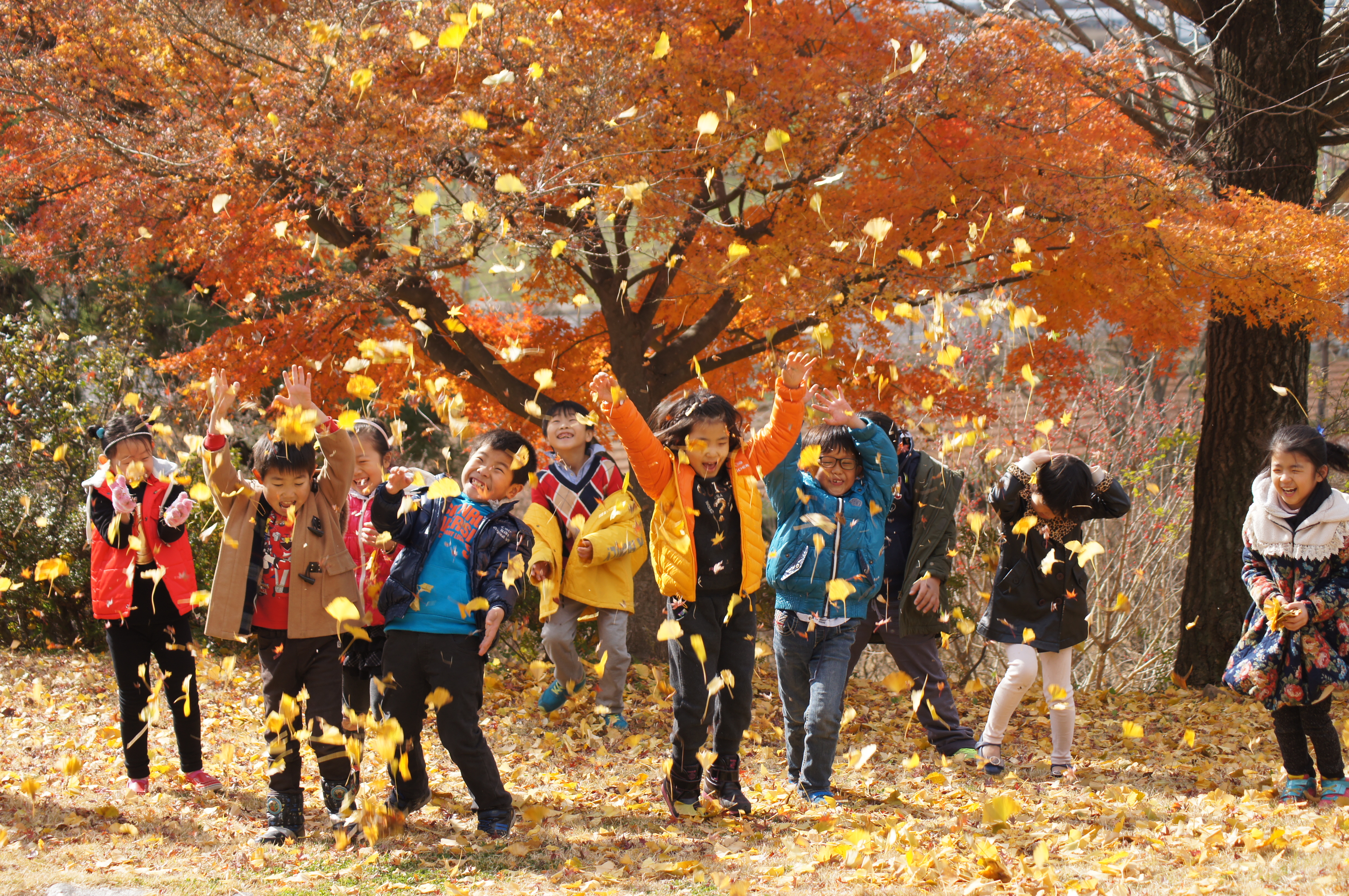 포충사에 현장체험학습 나온 아이들이 바람에 떨어지는 은행과 신나서 노는 모습