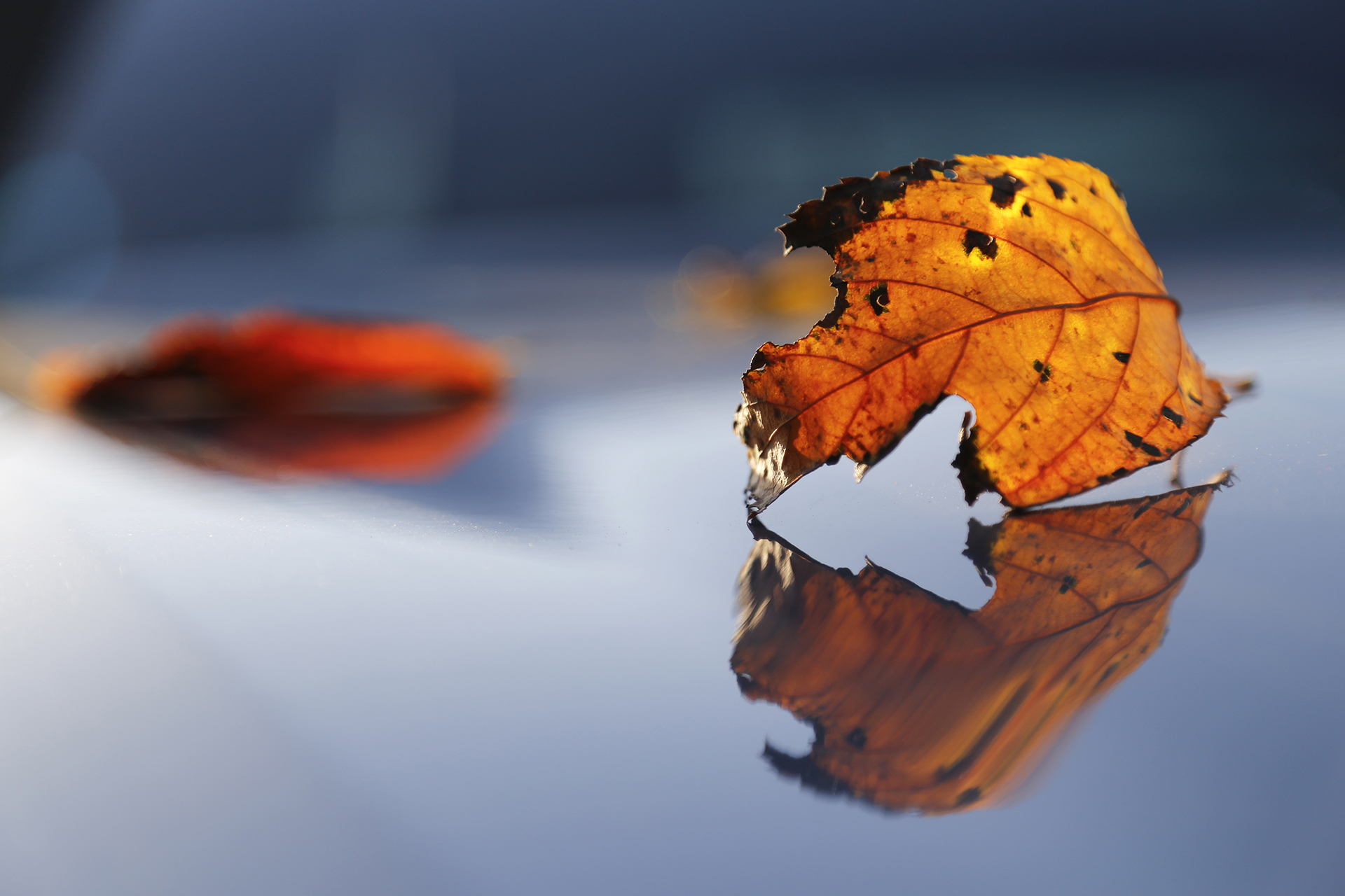 자동차 보닛 위에 내려앉은 단풍잎들이 지난 여름날의 이야기를 나눕니다.