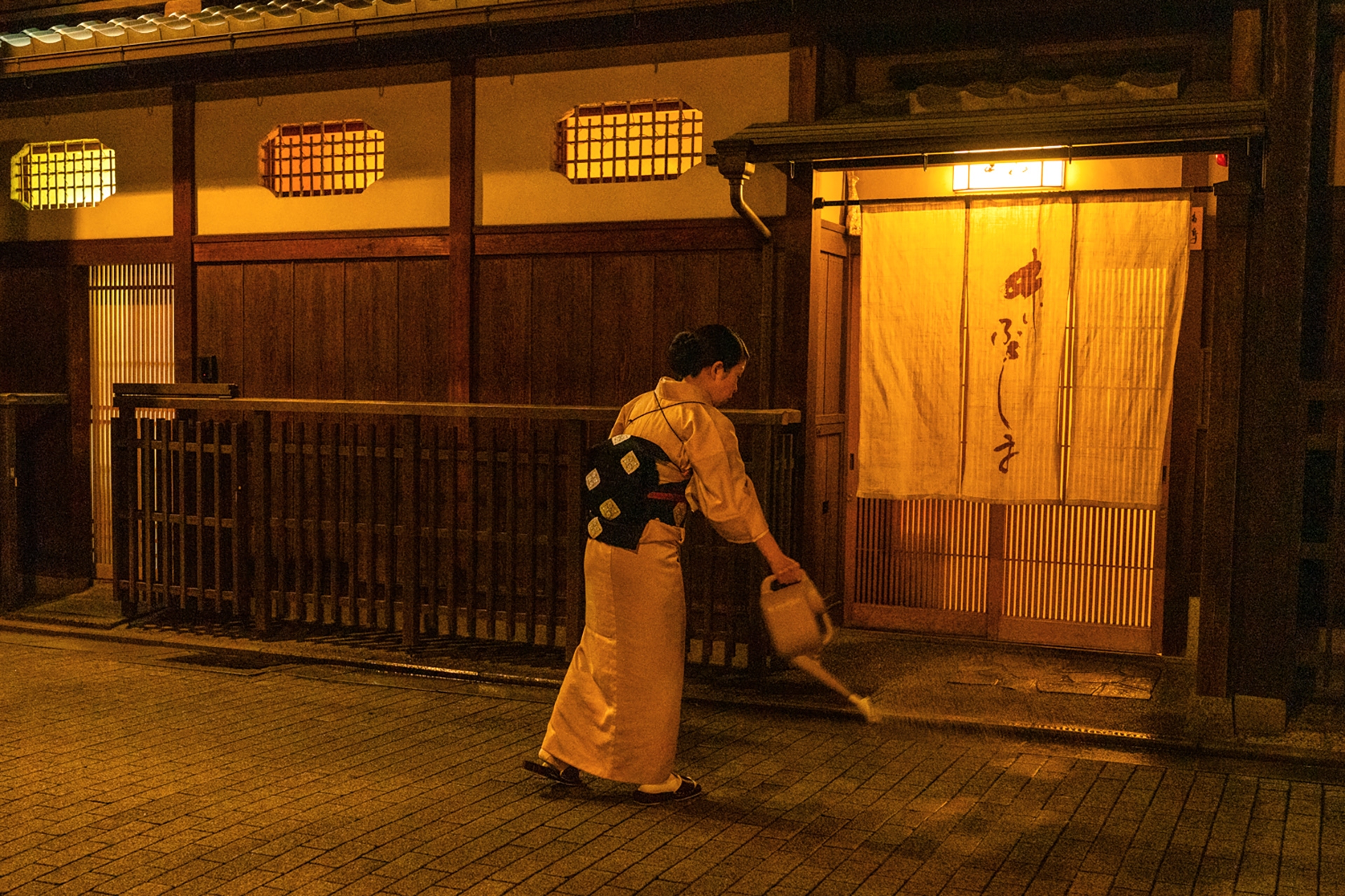 물뿌리고 빗자루로 청소를 한다