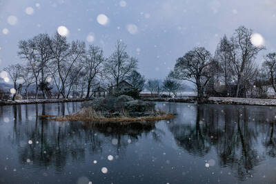 강가 살얼름위 길게 누운 나무 그림자.