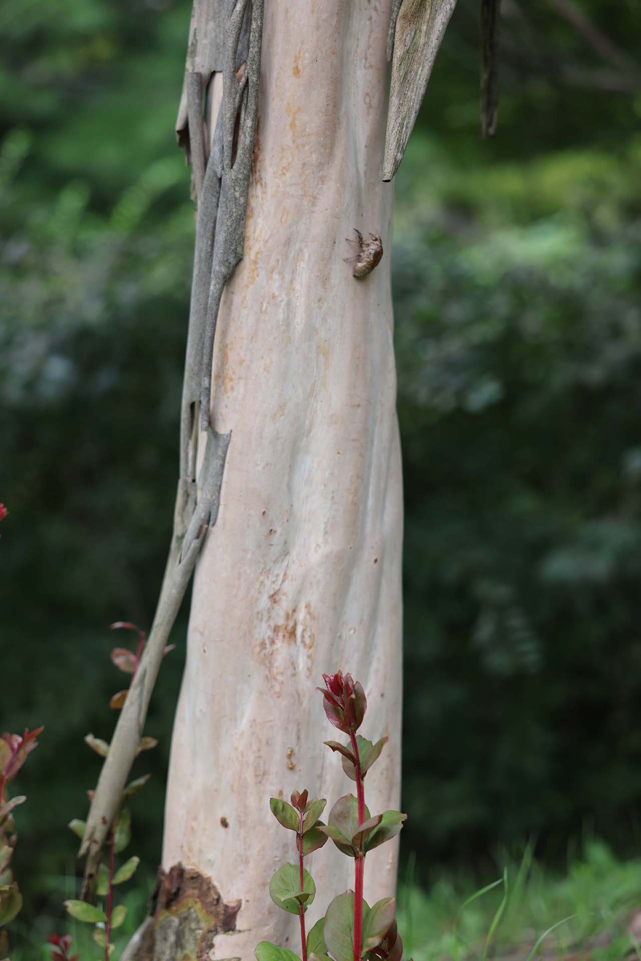 벗겨진 나무껍질 위로 매미의 빈 허물이 남아