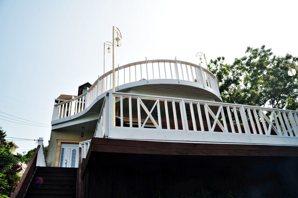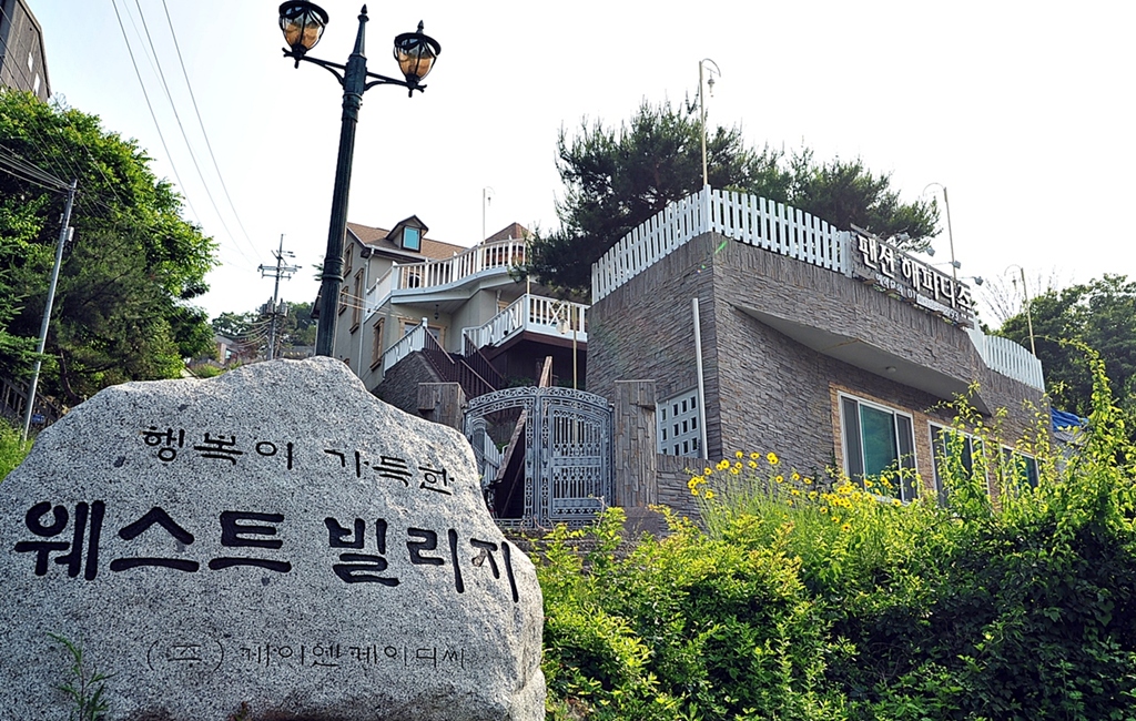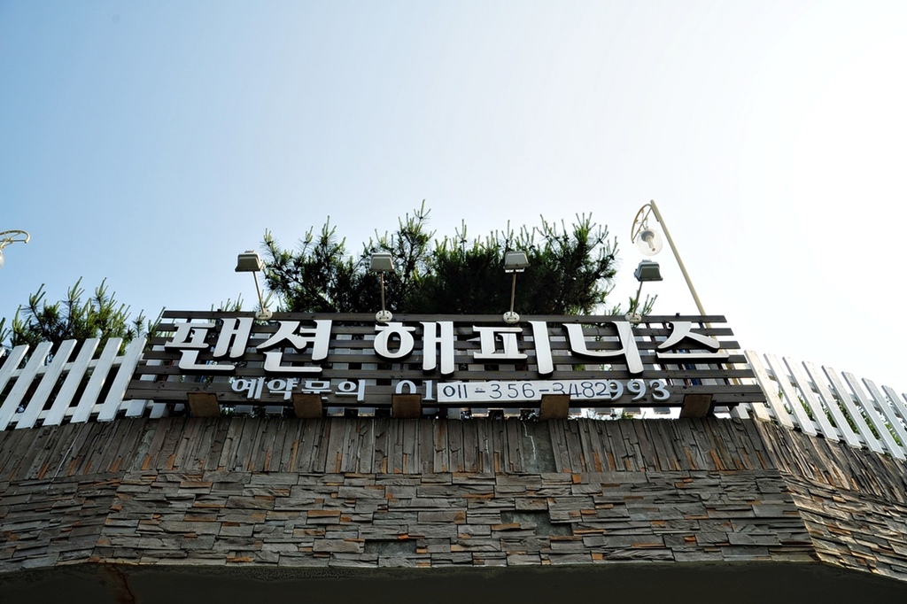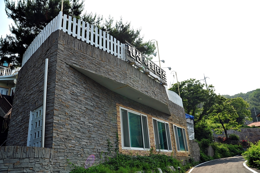 순풍호 분오리저수지 앞 언덕길에 위치한 해피니스팬션 정경... 길게 늘어진 3층이네요