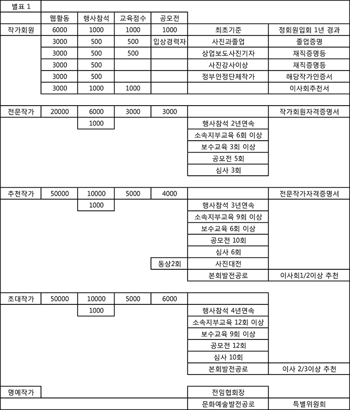 , 행사참석점수 500점 교육점수 500점 이상을 획득한 자 4. 대학 및 전문대학 사진과목 강사 이상으로 웹 활동점수 3,000점 행사참석점수 500점 이상을 획득한 자 5. 정부로부터 인정된 단체의 사진작가로서 웹 활동점수 3,000점 행사참석점수 500점 이상을