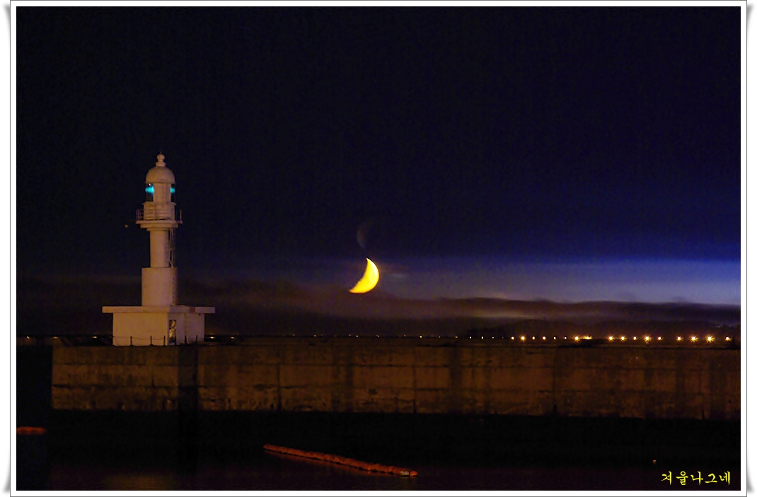 월미도에서 바라본 등대에 달이 걸려있는 야경입니다.