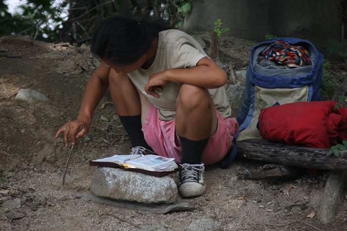 성경을 펴놓고 열심히 무언가 긋적이는 여인의