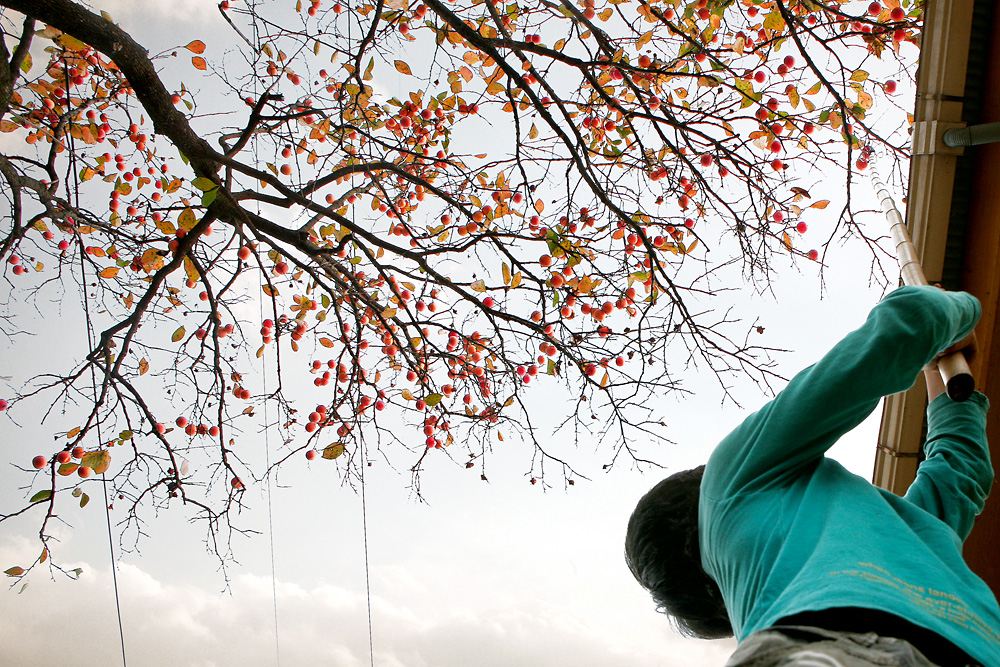 홍시를 따는 아이는 길게 쭈욱 장대를 들고....