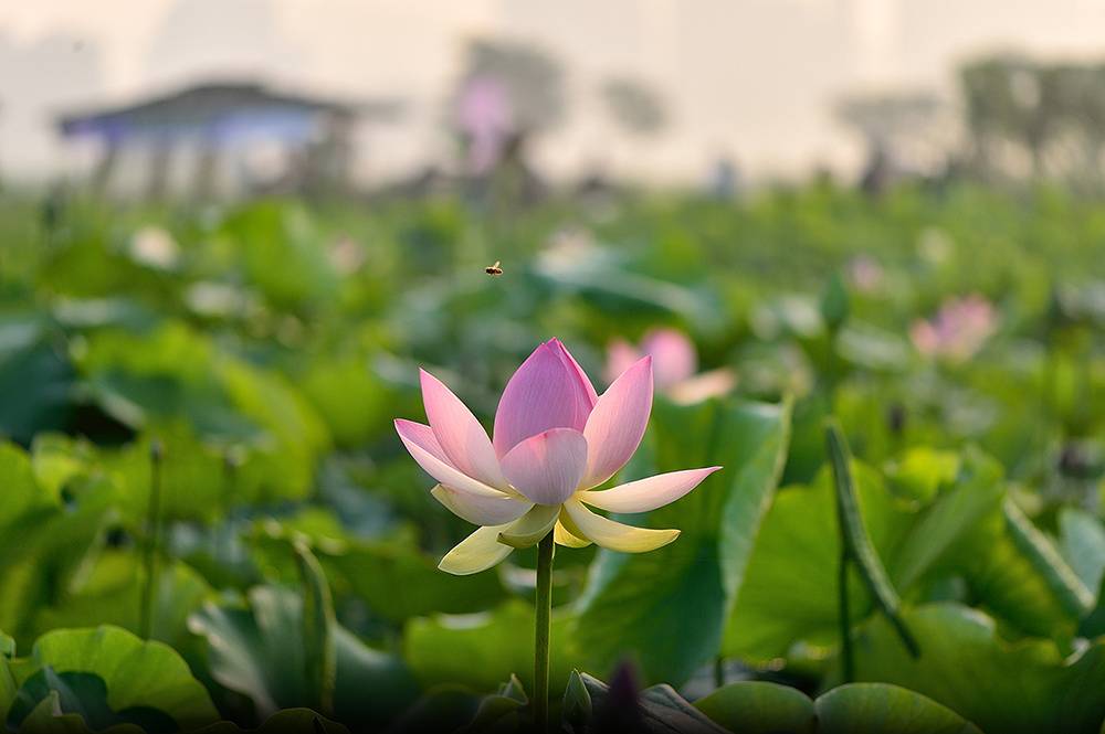 연꽃을 찾아 아침부터 분주히 일하는 일벌 꼭 누구------