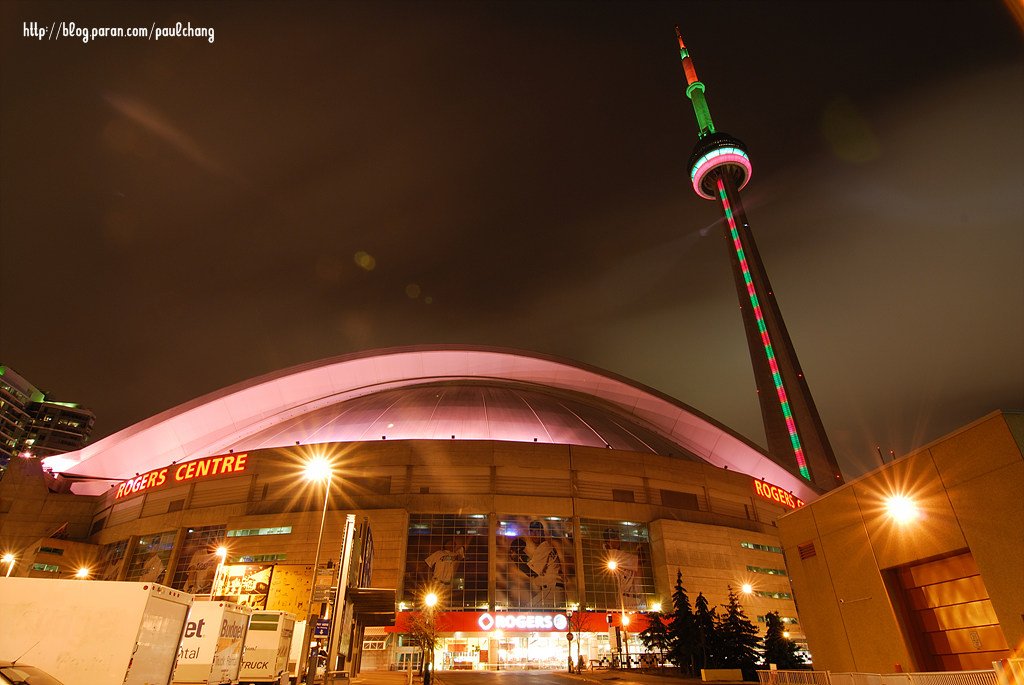 크리스마스 시즌에 맞춰 색동 입혀 놓은 CN Tower 와 Rogers Centre의 밤풍경