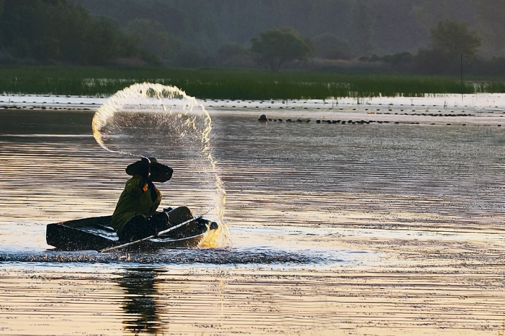 어부가 배에고인 물을 퍼내는 모습
