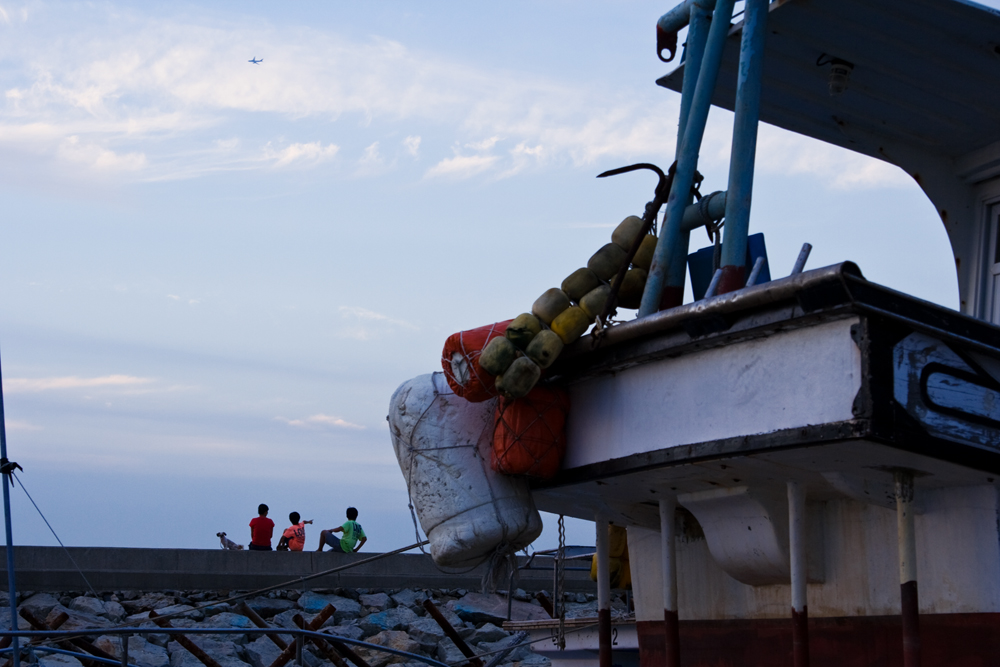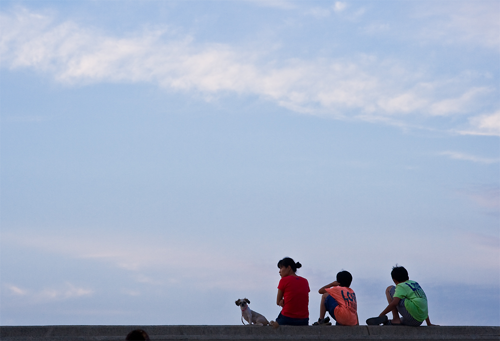 개 한 마리 데리고 저녁 바람 쐬러 부두에 나온 다정한 가족..