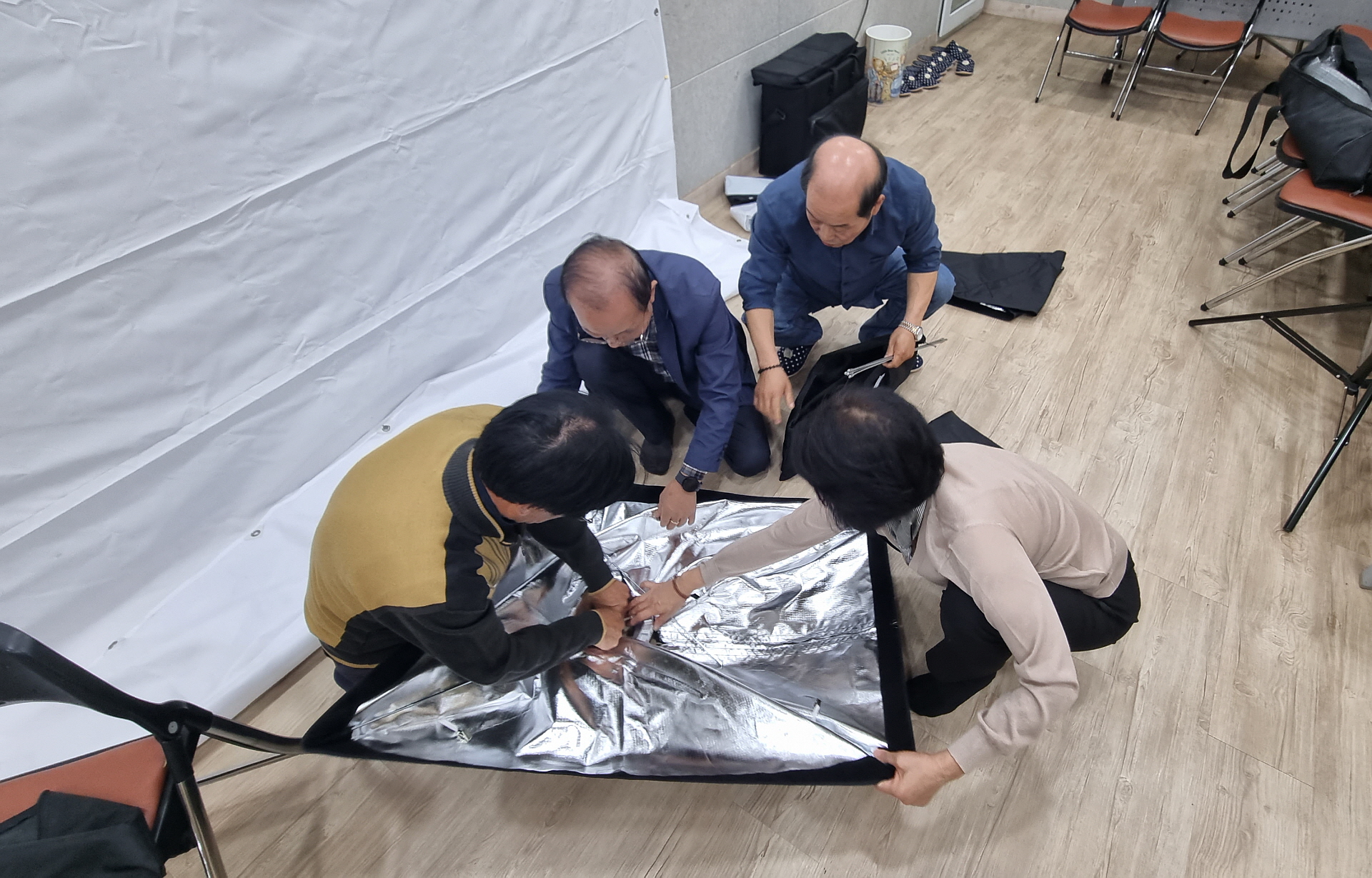 지부 회원들이 힘을 합쳐서 조명기구를 조립합니다.