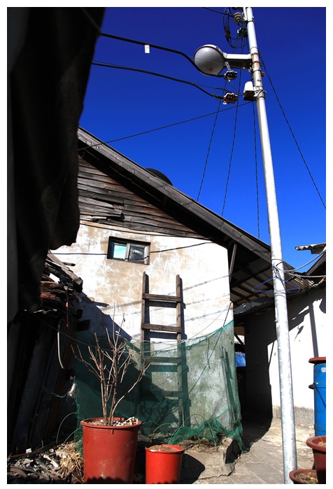 현관의 유리는 깨어져 버렸고, 이미 비어있는 집.. 저 건너에선 개발이 한창이다.