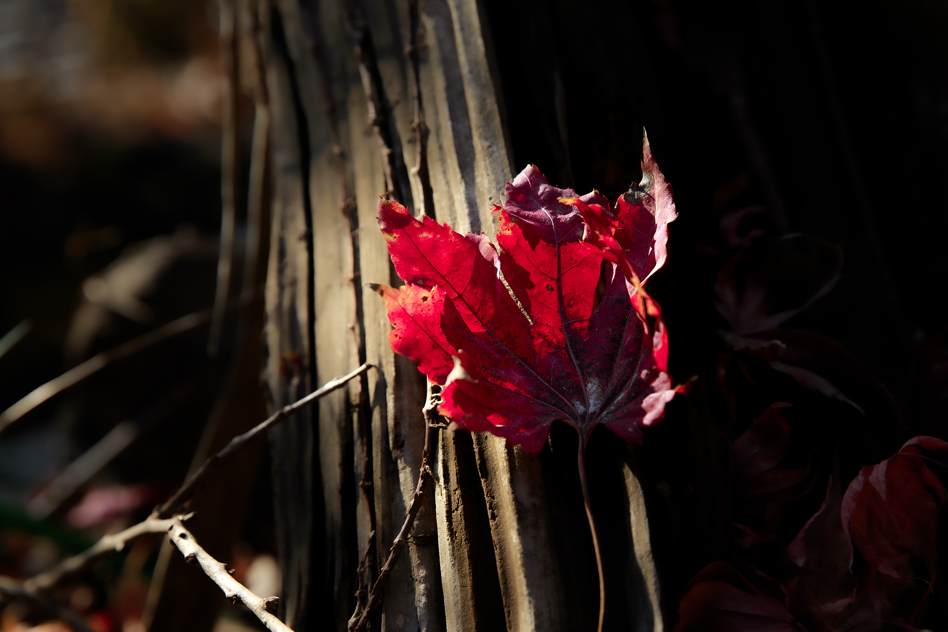 단풍잎이 고목에 기대여 잠시 쉬어본다.