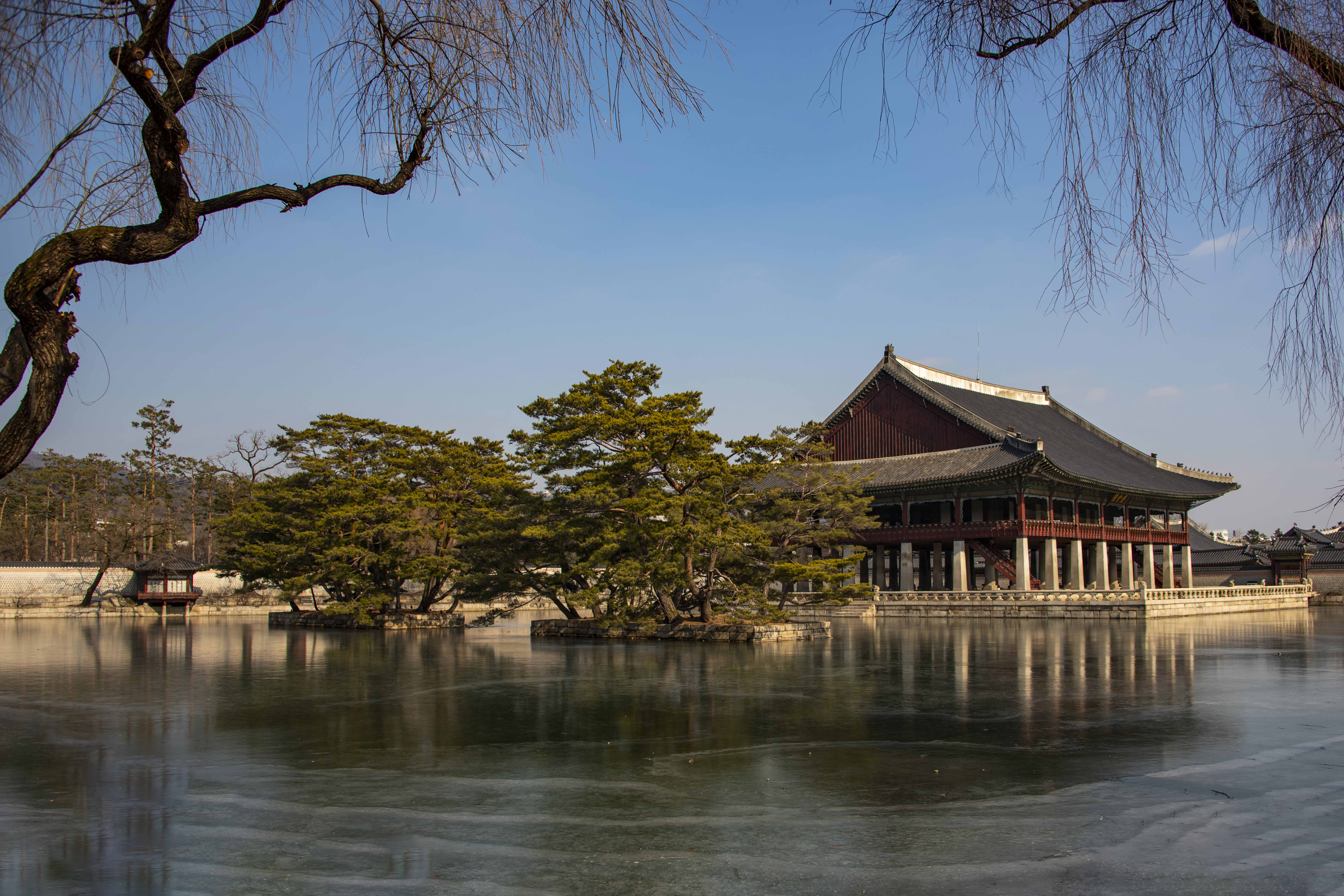 경복궁 궐내에 자리한 경회루 뒤로 보이는 작은 정자 하향정 모습이 보입니다.