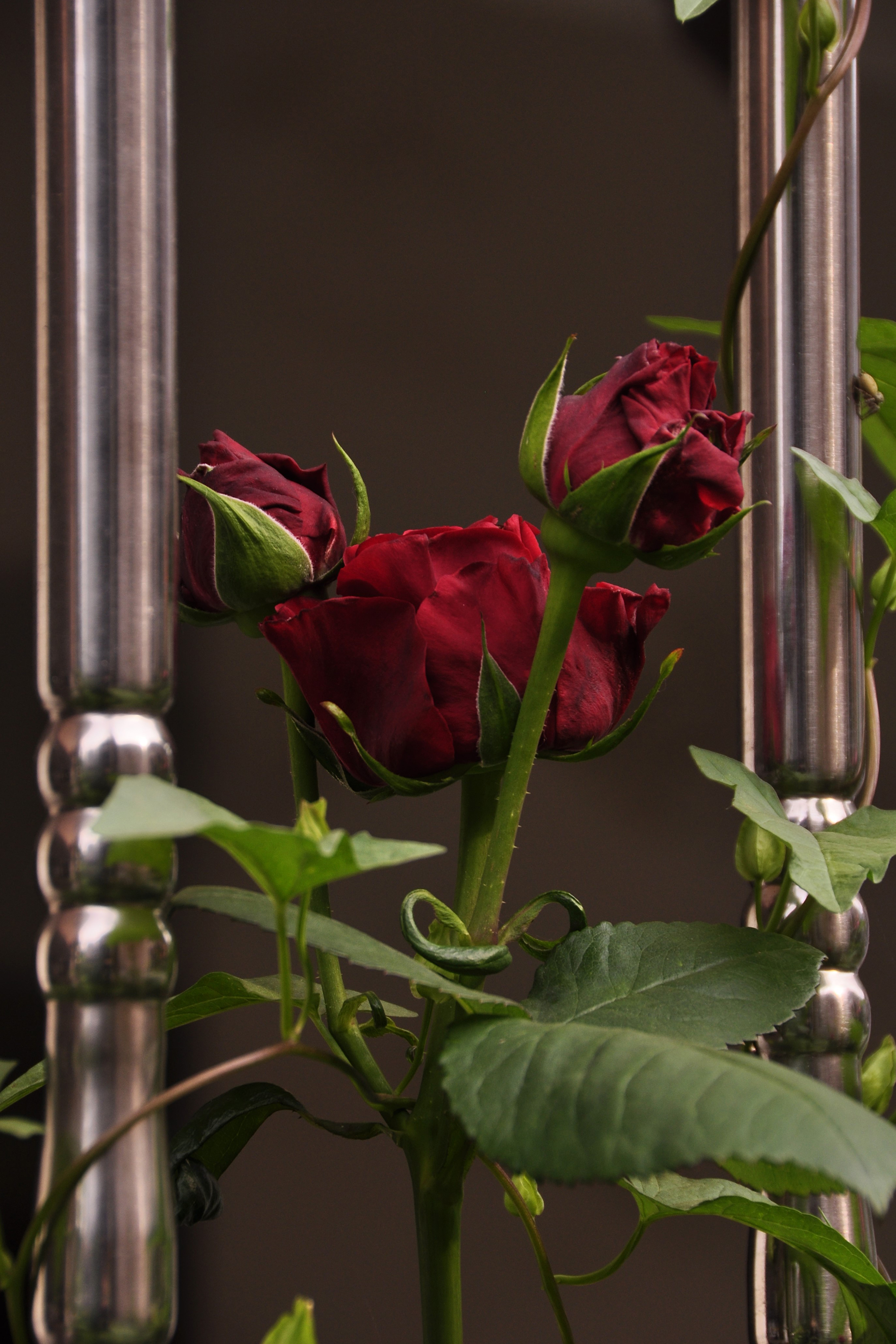 장미꽃과 올라가는 넝쿨이 엉클어진 모습입니다.