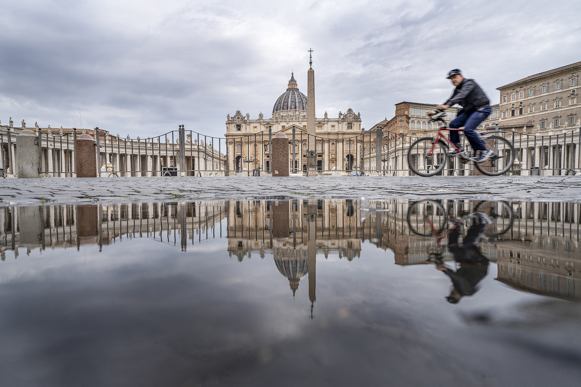 비오는 이른 새벽 성 베드로 대광장에서 빗물 웅덩이에 비치는