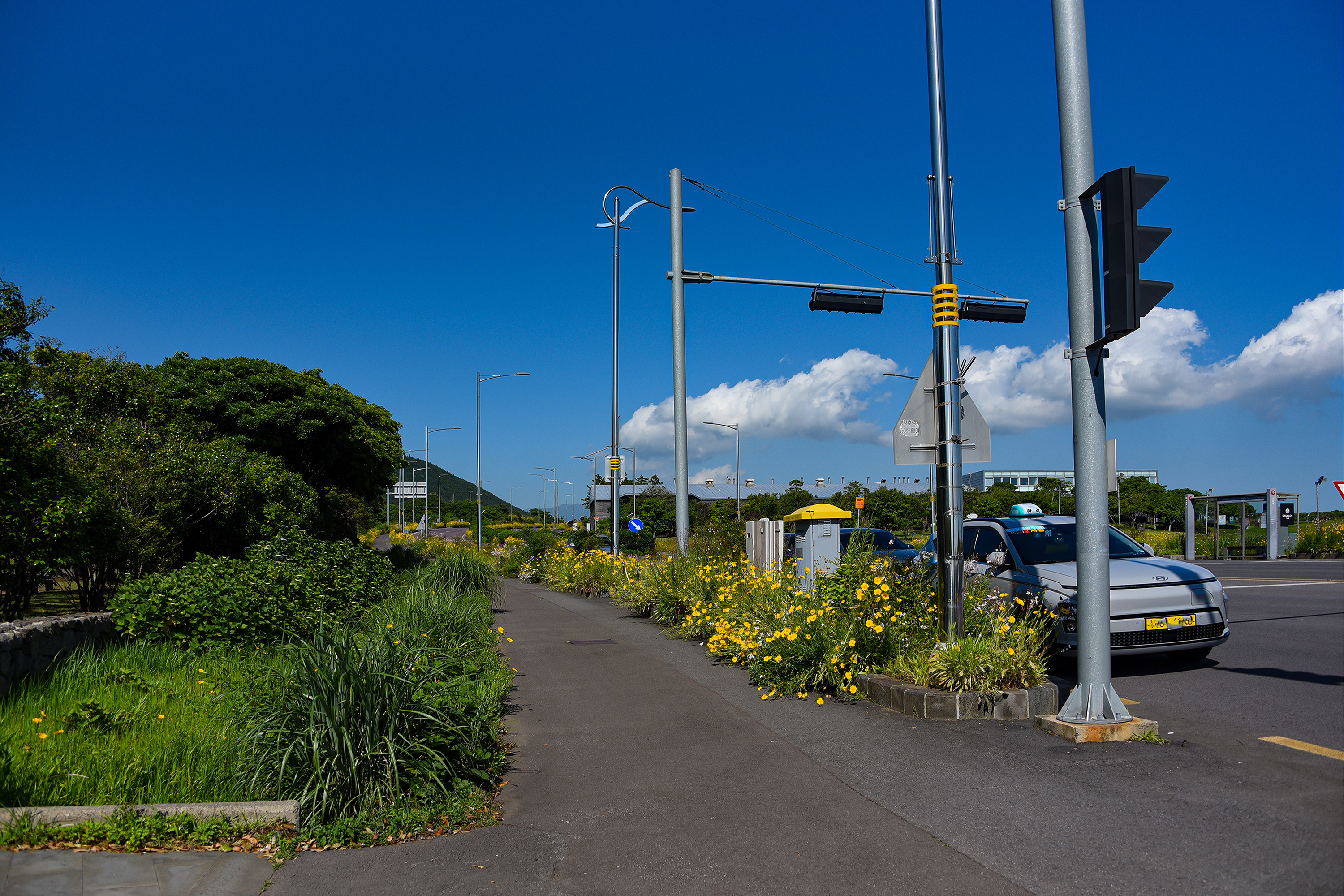 전신주 사이에 걸려 있는 고운 구름과 길가에 심어진 꽃들을 보면서 세상의 모습에 아름다움을 느낌니다.