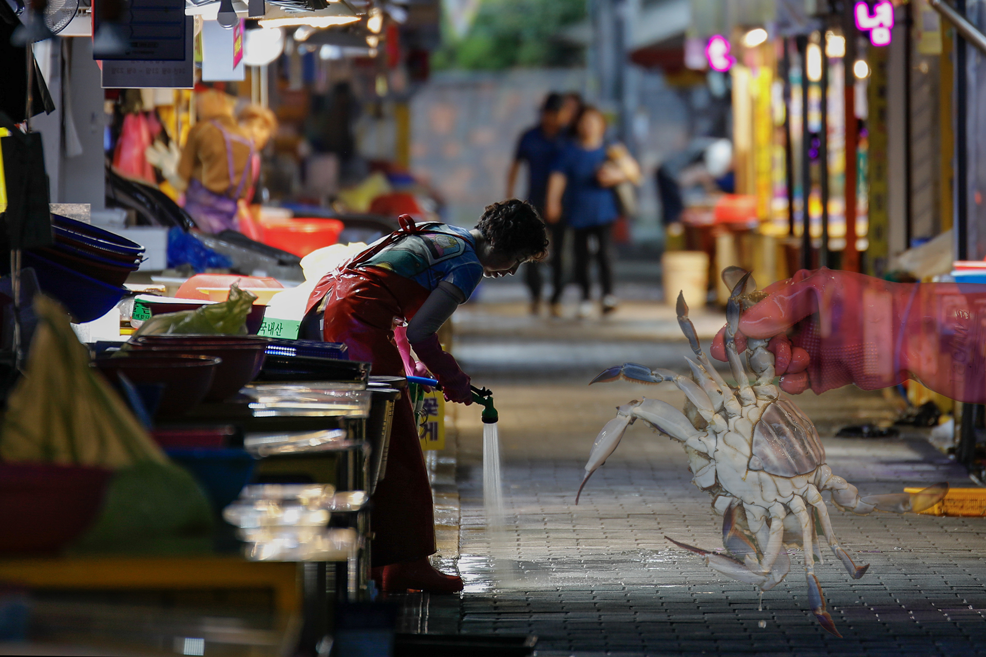 어수선한 가게 앞에 물을 뿌려 청소하며 손님 맞을 준비를 한다.