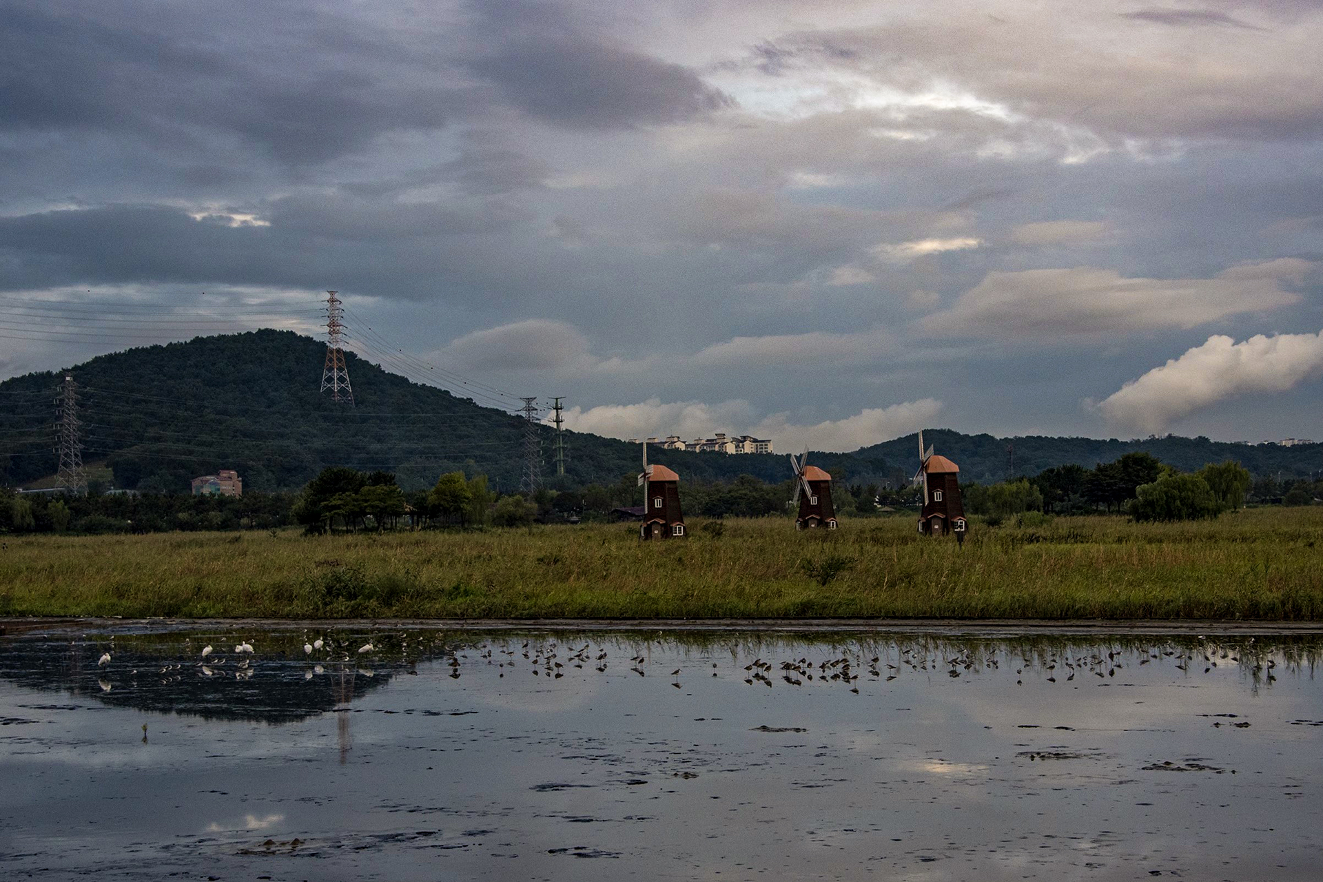 몇일전 소래습지 모습입니다~ 대조기로 인한 바닷물 수위가 올라가 소래습지 염전 안에는 새들의 피신처가 된것 같습니다. 큰도요새 검은머리물때새 저어새 등~