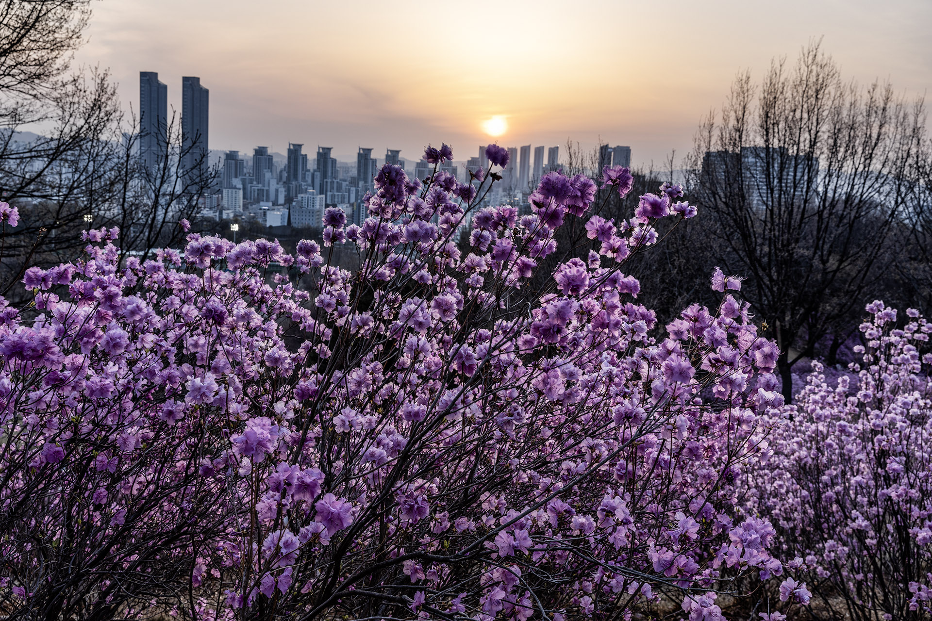 4월진달래동산의 저녁에는 분홍빛 진달래 꽃과